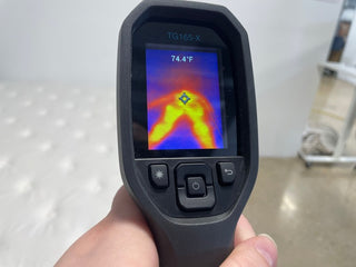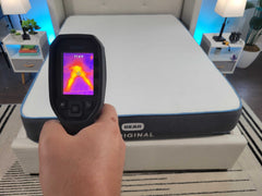 If you’re the type who kicks the covers off or cranks the A/C so high it feels like you’re sleeping in a meat locker, your mattress might not be doing a good job at regulating temperature. To check cooling, we use a thermal temperature gun to measure the surface temp of the mattress, then have a tester relax on it for 7 minutes. While they’re on the bed, we get some subjective feedback by asking if the cover feels cool to the touch and if the mattress warms up. When the timer goes off, we take another temperature reading and note the difference.