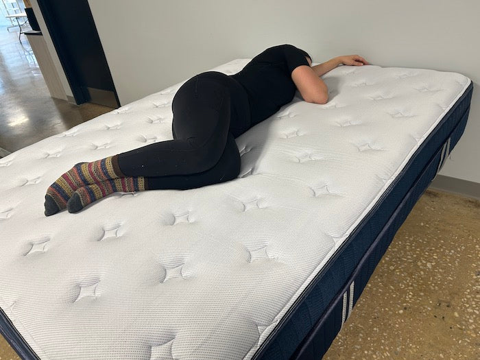 To test how responsive a mattress is, we have team members switch between different sleeping positions to see how easy it is to move around. We ask them to pay attention to whether they feel stuck in the bed or if the mattress helps them shift around.