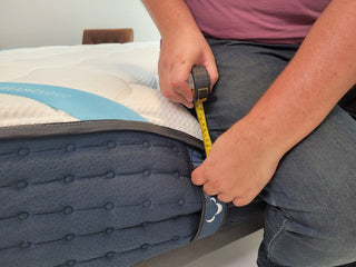 We also pay attention to how sturdy the edges of the bed are. Ideally, the edges should offer the same level of support as the center of the bed. This is great for couples or solo sleepers who like to spread out and use the whole surface without feeling like they’re about to fall off. Since a full-size bed is smaller than a queen, there’s even less room for weak edge support, especially if you’re sharing the bed and tend to sleep near the edge. We test edge support by sitting and lying on the edges to see how well we feel supported. We also sit on the edge and use a measuring tape to check how much the layers compress to measure sinkage.