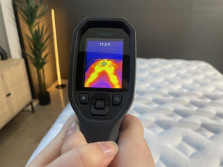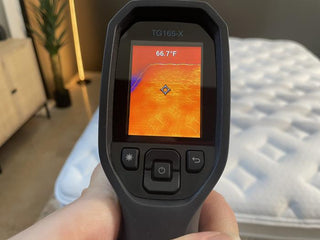 We use a thermal gun to track the rise in surface temperature of a mattress, which helps us determine how much heat it retains during use. We measure the surface temperature twice: once before any testers lie down, and again after our tester has spent about seven minutes napping on the bed. On average, we observe a temperature increase of around 5.6 degrees, which we consider to be average-to-good cooling.