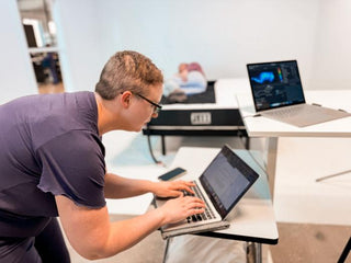 Whenever possible, we test pressure relief using a specialized mat, which we place on the mattress surface before our testers try it out. As the testers lie on their back and side, the mat uses thermal imaging to track where pressure builds up along their body. The result is a color-coded map that highlights areas of high (red and yellow) or low (blue and green) pressure.