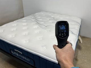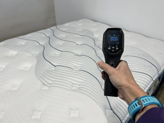 When we test how cool a bed is, we use a thermal gun to check the surface temperature twice: once before any testing and again after lying on it for seven minutes. The temperature rise tells us how well the bed cools and helps determine its score. A 7-degree increase is typical for decent cooling, and beds that have less of a rise usually get a 4.5 or 5 out of 5. If the temperature goes up more than that, it probably means the bed won’t be great for hot sleepers. We also take into account whether the bed felt warm or cool while lying on it, which can impact the final score.