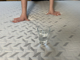 We test motion isolation in two ways. First, we put a glass of water on one side of the mattress and move around on the other side. How the water reacts tells us how much movement is spreading across the bed. Then, we have another tester climb into bed with us while we're blindfolded. Whether or not we can feel them moving around—getting in or switching positions—tells us how well the bed isolates motion. Both tests affect the final score out of 5.