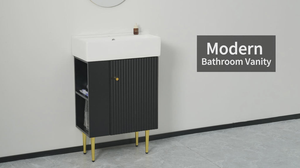 Modern Wood Bathroom Vanity with Ceramic Sink, Left Side Storage, 21.6" W x 12.2" D x 33.9" H, MDF Cabinet with Gold Zinc Alloy HandlesDescription Copy