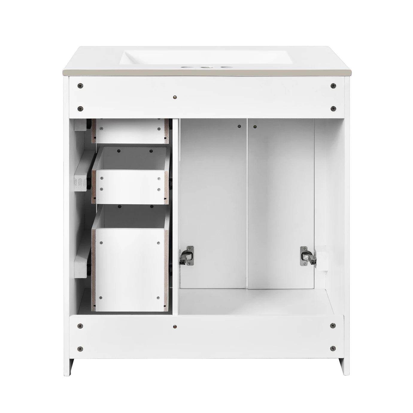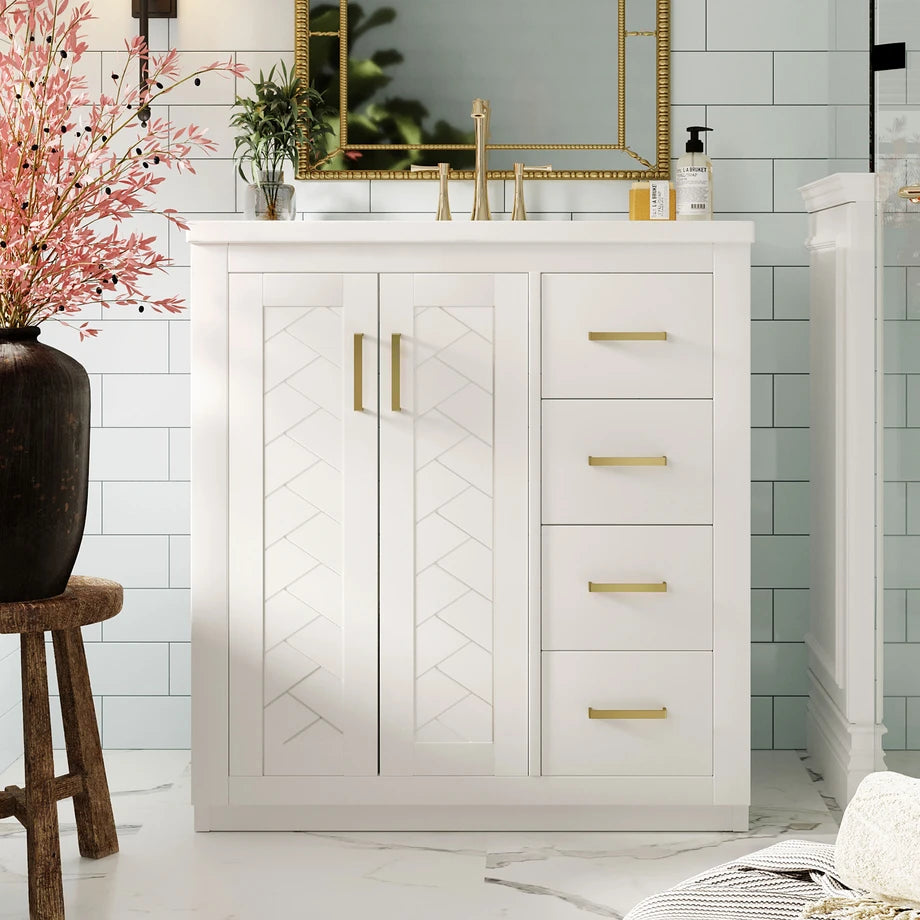- [ Multi-Purpose Cabinet & Concealed Storage ] Are you looking for stylish and functional storage solutions for your bathroom? Our bathroom vanity provide ample space for all your toiletries and bathroom essentials. The combination of the cabinet body and the drawer perfectly stores all kinds of bathroom products and keeps the necessities away from water stains and dust. Soft-close doors and drawer fronts feature a water-resistant paint finish for durability.