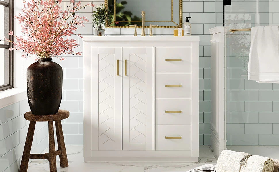 About This ItemFunctional Keywords 1.Solid Wood Frame 2.Soft-Closing Hinges 3.High Quality MDF Boards 4.Smooth Drawer Slide 5.Ample Storage Space Appearance Keywords 1.Retro Style 2. Exquisite Metal Handle 3.Unique Groove PatternDimension & WeightDimension of Overrall Product 30'' * 18'' * 34'' Dimension of Storage Cabinet 29.52'' * 17.16'' * 32.99'' Dimension of Basin Sink 30'' * 18'' * 6.69'' Inner Length and Inner Width of The Basin Sink 18.97'' * 10.43'' Weight of Overroll Product 94.36lbs Weight of Storage Cabinet 61.36lbs Weight of Basin Sink 33lbs Notice Measurements presented are rather close estimations of the true value, and may be subject to human errors. Additional informationCapacity Overrall:300lbs Panel:50lbs Drawer:50lbs Number of Drawers 3 Vanity Top Thickness 1'' Faucet Mount 4''(Faucet not included) Style Retro Style Material MDF Board & Solid Wood/Ceramic Package Included Bathroom Vanity & Sink& Screw Pack & Instruction