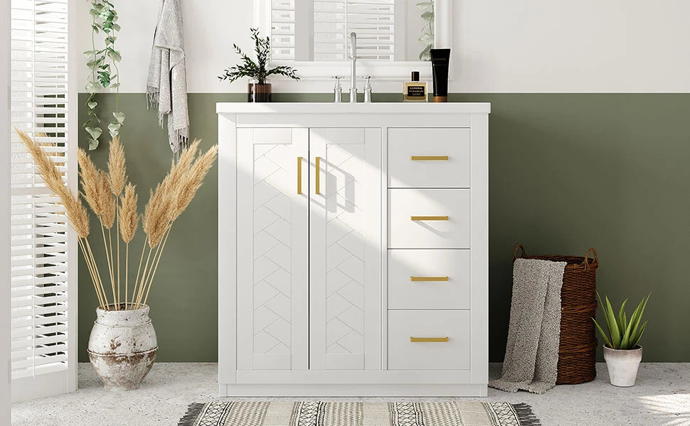 Item Code N710P191947K Product Type Single Box Product Product Name 30'' Bathroom Vanity with Ceramic Sink Combo, Solid Wood Frame Bathroom Storage Cabinet, Freestanding Vanity Set with 3 Drawers& Soft Closing Doors Place of Origin Viet Nam Main Color White Main Material Ceramic,Solid Wood+MDF Use Case Bathroom Product Dimensions