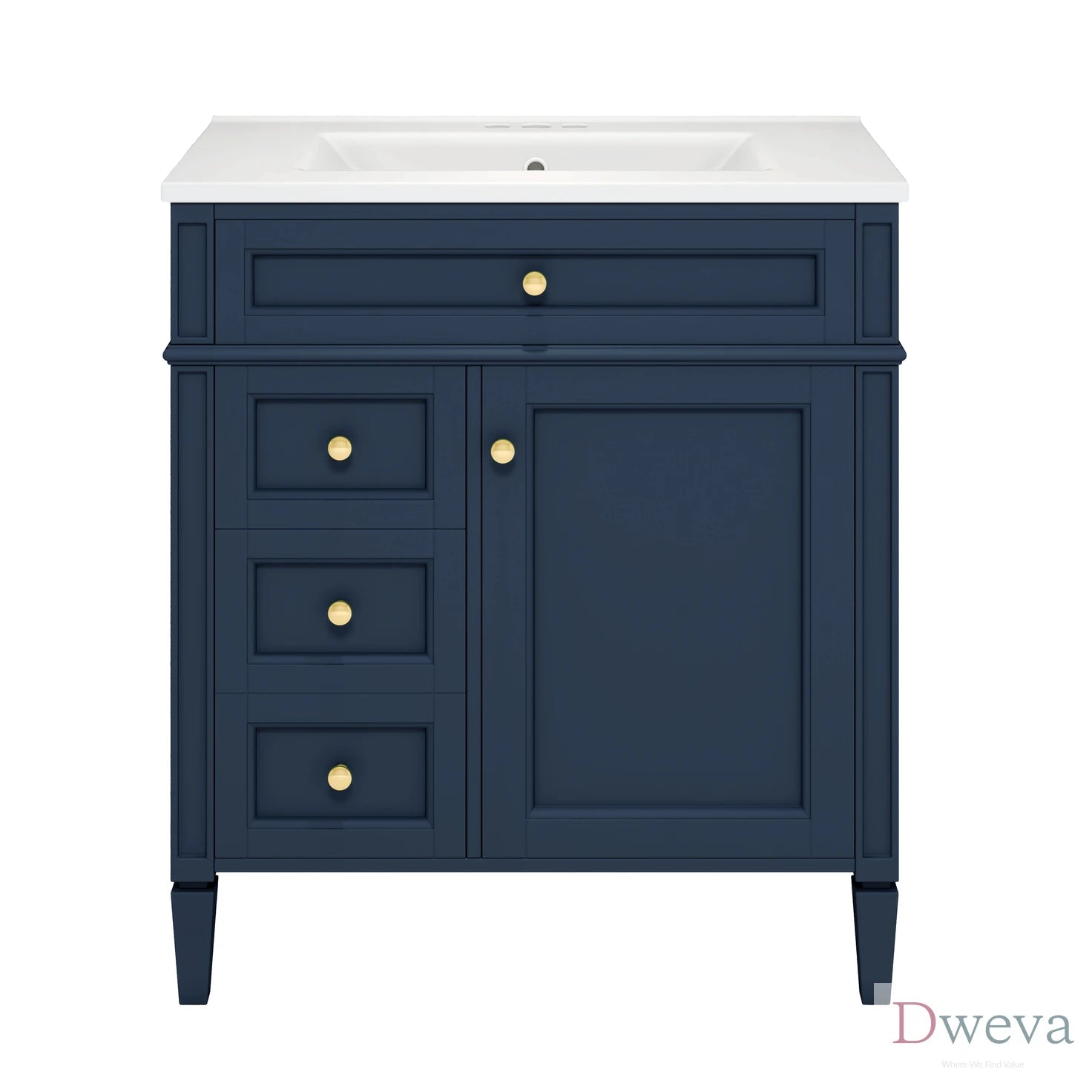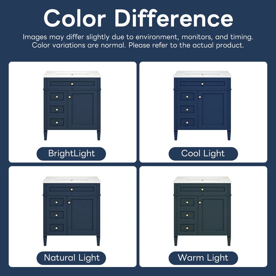 About This ItemFunctional Keywords 1.Cabinet Door Organizer 2.Adjustable Shelf 3.Tip-out Drawer 4.Smooth Metal Drawer Slides 5.Diverse Storage Functions Appearance Keywords 1.Modern Design 2.Exquisite Roman Leg Design 3.Textured HandleDimension & WeightDimension of Overrall Product 30'' * 18.3'' * 33.8'' Dimension of Storage Cabinet 29.3'' * 18.2'' * 32'' Dimension of Basin Sink 30'' * 18.3'' * 6.69'' Inner Length and Inner Width of The Basin Sink 18.97'' * 10.43'' Weight of Overroll Product 101.63 lbs Weight of Storage Cabinet 69.21 lbs Weight of Basin Sink 32.42 lbs Additional InformationProduct Name Bathroom Vanity with Sink Country of Origin Vietnam Main Color Blue Style Modern Material Cabinet: MDF+Solid Wood(Pine)/ Handle (iron)/ Sink: Ceramic Finish Type Undermount/Drop in Cabinet Shape Rectangular Sink Shape Rectangular Faucet Mount: 4" Centerset faucet will fit (faucet not include) Anti-spill Hole Includeed Yes Sink Edge Thickness 1" Capacity Overrall:300lbs/ Panel:50lbs/ Drawer:50lbs Door Included Yes Number of Doors 1 Drawer Included Yes Number of Drawers 3 Level of Assembly All Assembly Required Adult Assembly Required Yes Recommended Number of People for Assembly 1~2 Notice The color match of the actual product and the product shown in the picture may not be exactly the same. Affecting factors such as lighting, screen settings and resolutions may contribute to the inaccuracy of the color.