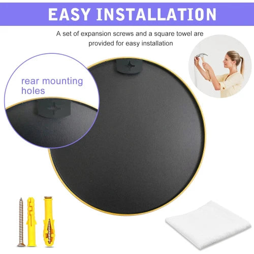 - The round mirror comes with reinforced hooks and screws, and we put it installation manual inside, and it is easy for you to install and hang it.