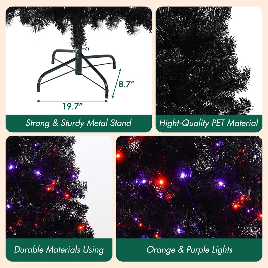 Additional InformationBulb Type LED Light Color Orange & Purple Light Functions Combination/In wave/Sequential/Slo glo/Chasing/Flash/Slow fade/Twinkle/Flash/Steady on Power Source Electric Plug-In Light Count 250 Stay-Lit Bulbs Yes Branch Tip Count 900 Number of Assembly Sections 4 Tip Material PET Branch Construction Hinged Tree Durability UV Resistant Needle Color Black Stand Included Yes Stand Material Metal Location Indoor Use Only Features Tree Type Artificial