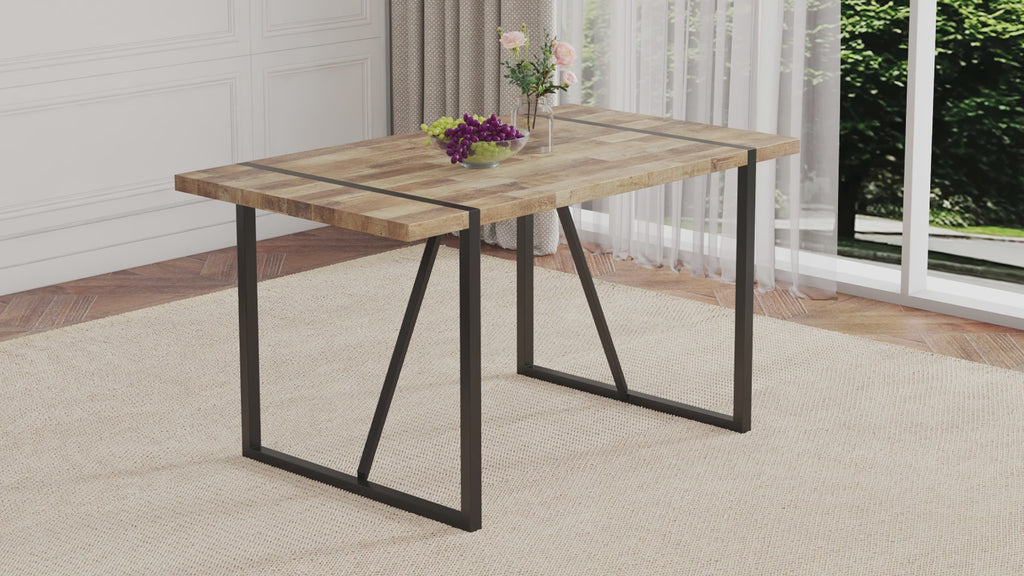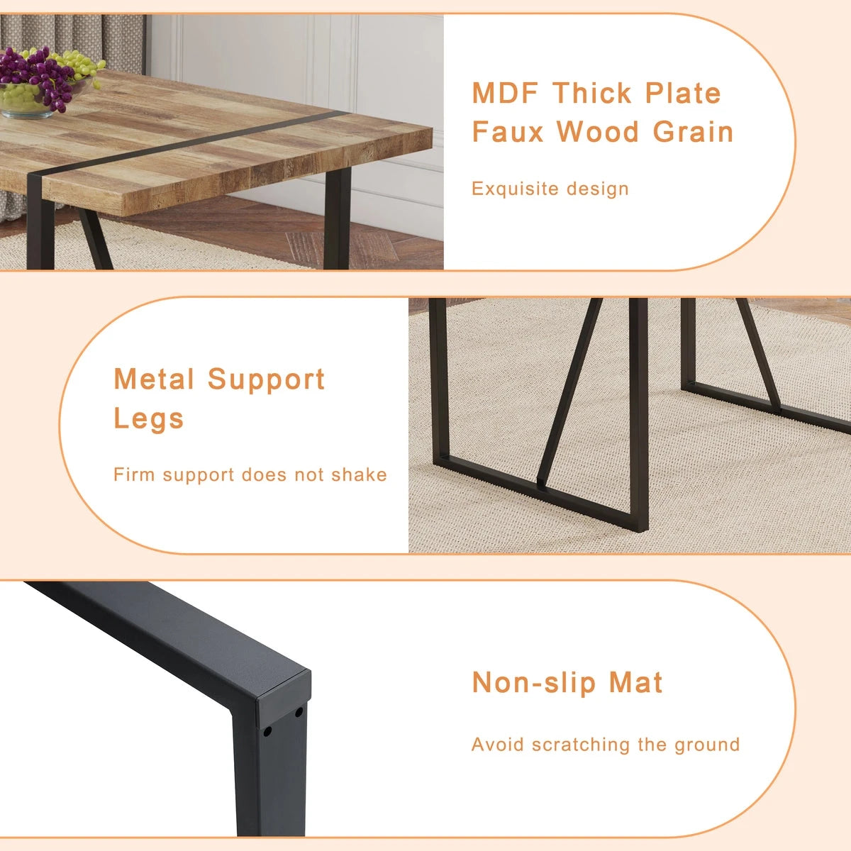This minimalist retro rectangular dining table is a perfect blend of contemporary design and classic style. Featuring a specially textured MDF wood tabletop and sturdy black metal legs, it seamlessly fits into various home decors, including modern light luxury and minimalist wooden styles. The table provides a cozy dining space, ideal for family meals or small gatherings, while its unique texture and splicing method add a touch of design elegance to any room.Feature Bullets