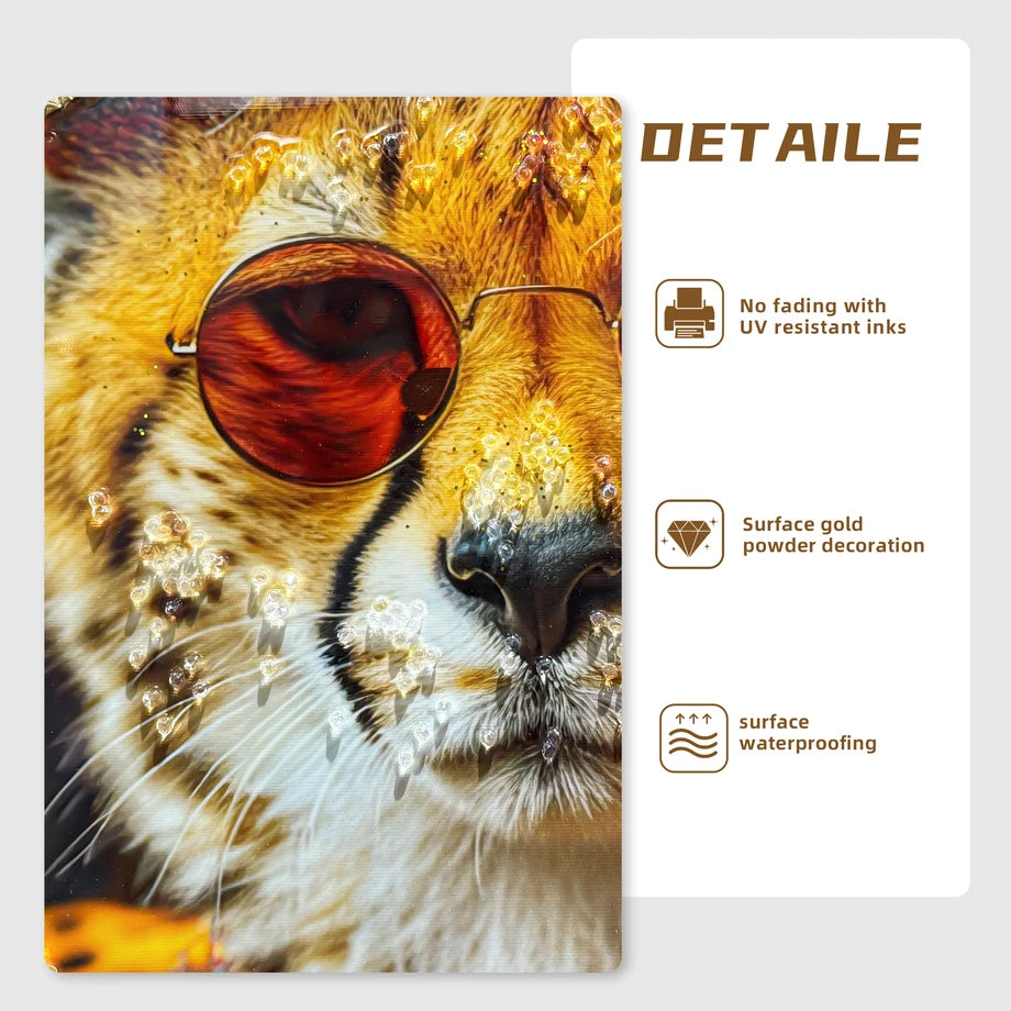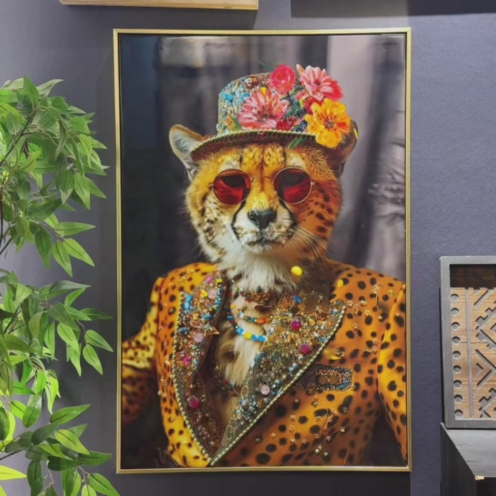 Item Code W3374P322233 Product Type Single Box Product Product Name Abstract Art Wall Decor: Stylish Cheetah in Leopard Print Suit with Sunglasses and Hat Featuring Flower - Unique Modern Canvas Painting for Living Room, Bedroom, Office decorative picture Place of Origin China Main Color Gold Main Material Canvas,Plastic Product Dimensions