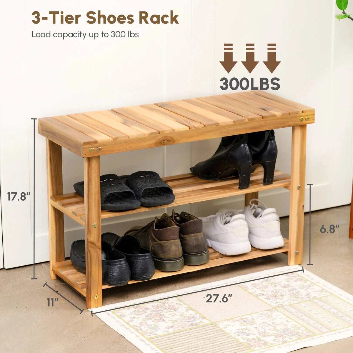 Acacia Wood Shoe Rack Bench, 2-Tier Natural Wooden Organizer for Entryway or Bathroom, Warm Grain Finish, 27.6"L x 11"W x 17.8"HDescription Copy