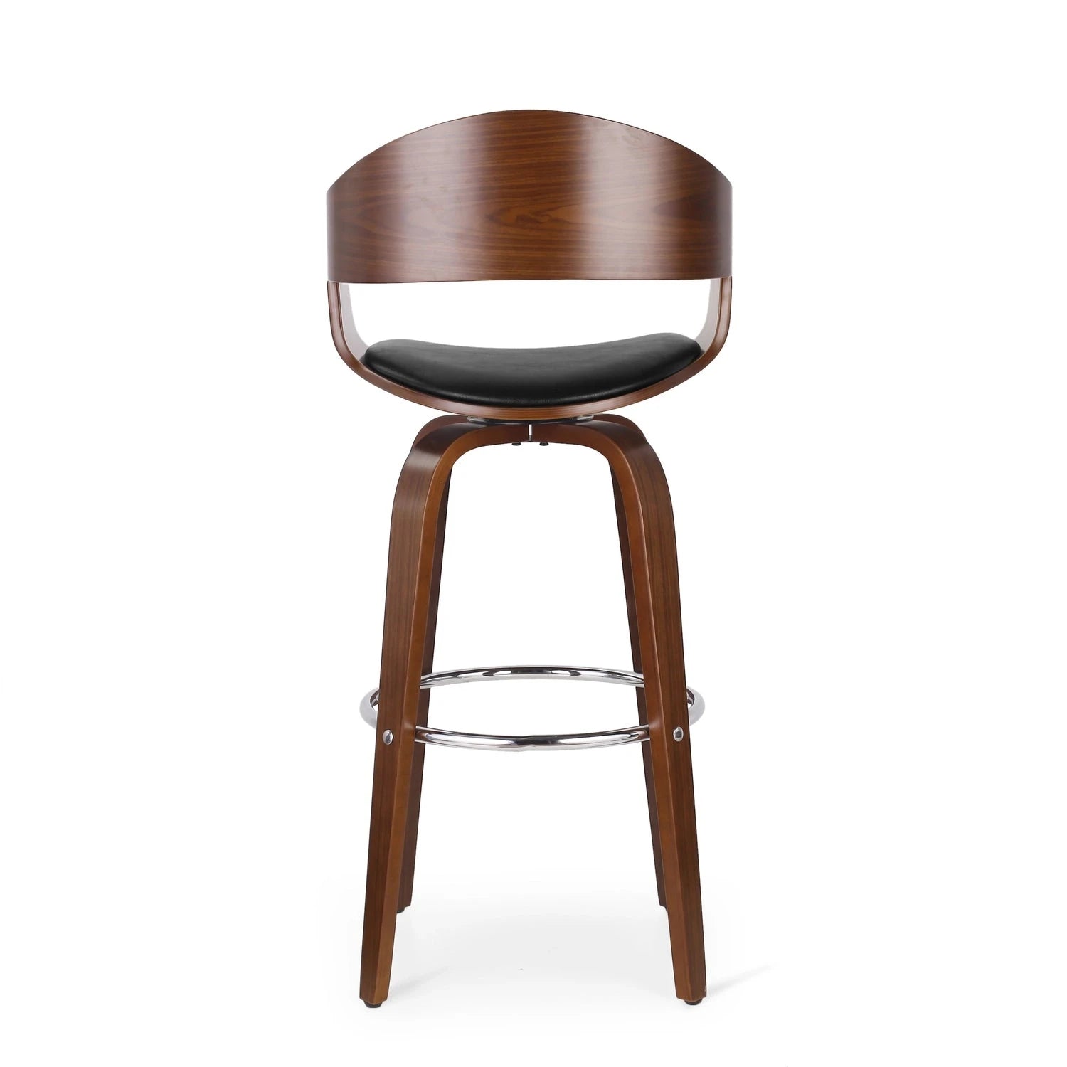 Upgrade your interior decor effortlessly with our exquisite dining barstool. Featuring refined wood and upholstered seating, it exudes mid-century modern appeal while offering practical functionality for your kitchen nook or home bar. The beautifully crafted bentwood frame ensures durability and stability for you and your guests. With a convenient swivel function and a sleek chrome-finished foot rail, this barstool adds a sophisticated touch to any home, combining style and comfort seamlessly.