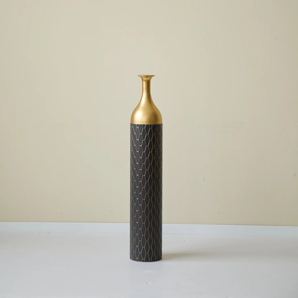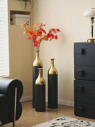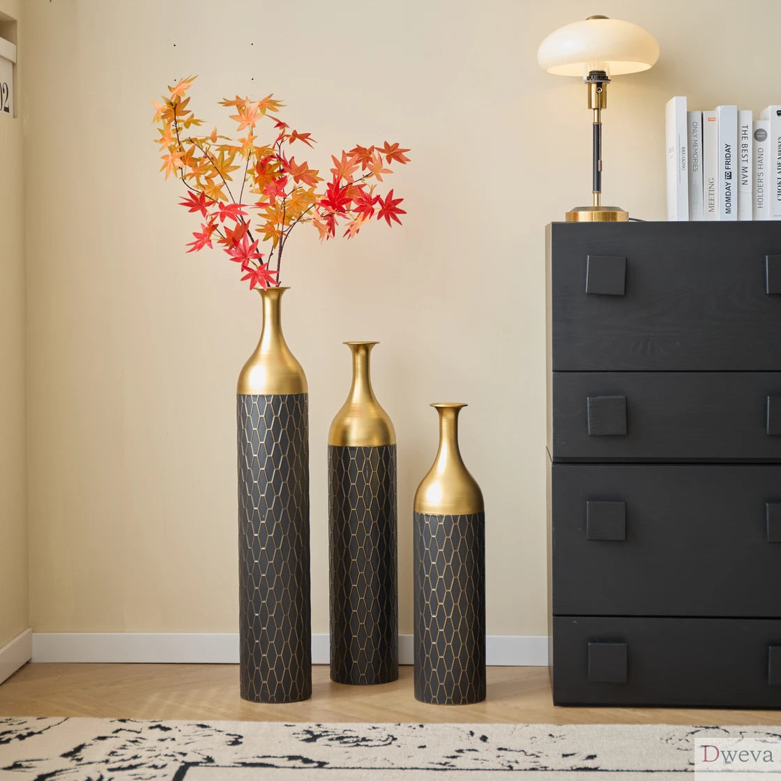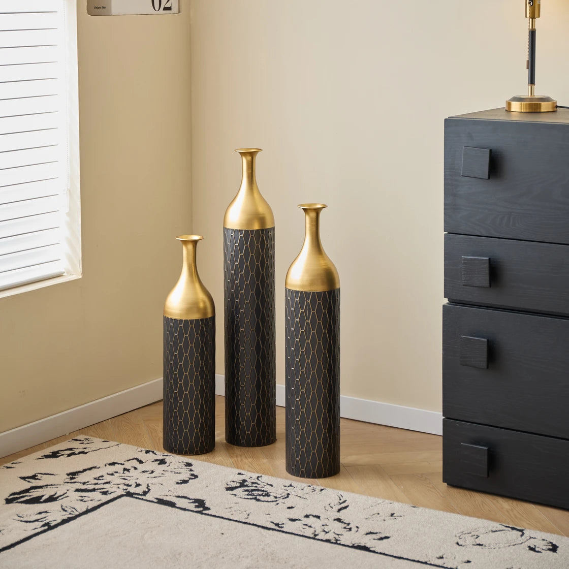 Here is a refined product description that aligns with your standards:---Make a sophisticated statement with this set of three decorative metal vases, where graceful form meets glamorous detail. Each cylindrical vase features a matte black body adorned with a sleek golden lattice pattern, seamlessly transitioning into a polished gold-toned funnel neck that adds visual contrast and elegance. Crafted from durable metal, these vases bring a luxurious yet modern aesthetic to any space. The set includes three sizes, measuring approximately 24 inches, 28.7 inches, and 33.4 inches talleach with a 5.7-inch diameter, making them ideal for floor or console displays. Whether styled with dried florals or displayed as standalone art pieces, their slender profiles and sculptural curves lend a refined charm to living rooms, entryways, or dining spaces. The fusion of black and gold finishes offers timeless appeal, elevating your décor with texture, dimension, and a bold decorative accent.Feature Bullets