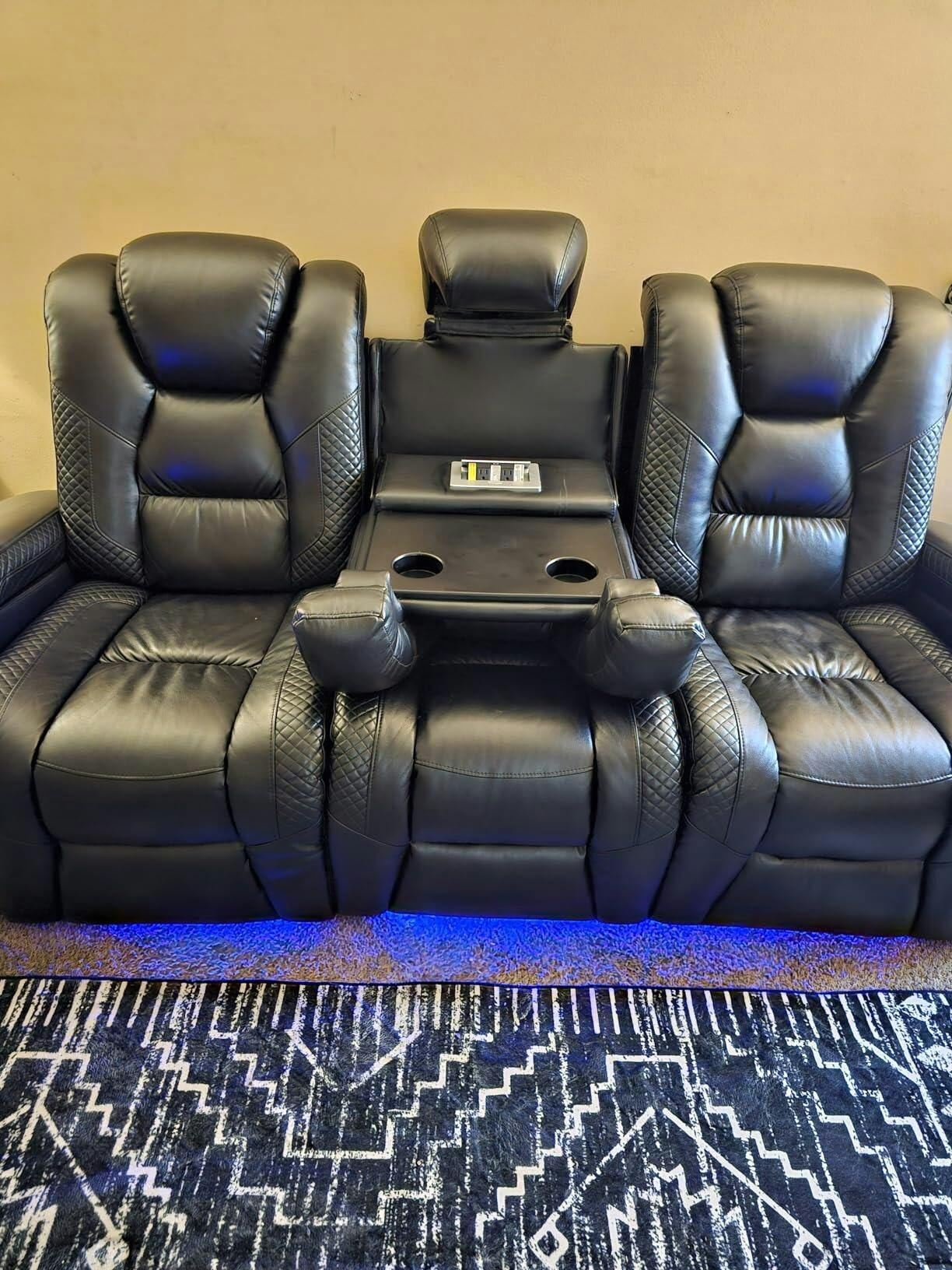 You’re paying for a full living-room command center in one set: breathing leather upholstery, a solid wood and spring support build, motorized reclining, integrated charging, storage, cup holders, and ambient LED lighting, delivered as a complete 3-piece sectional.