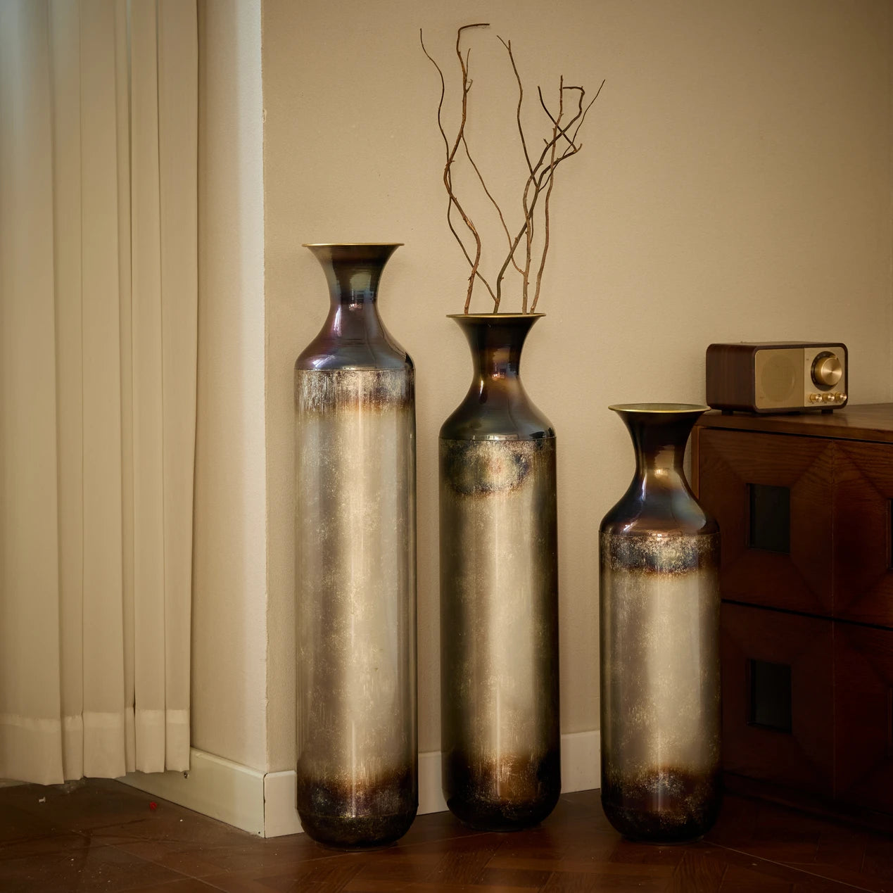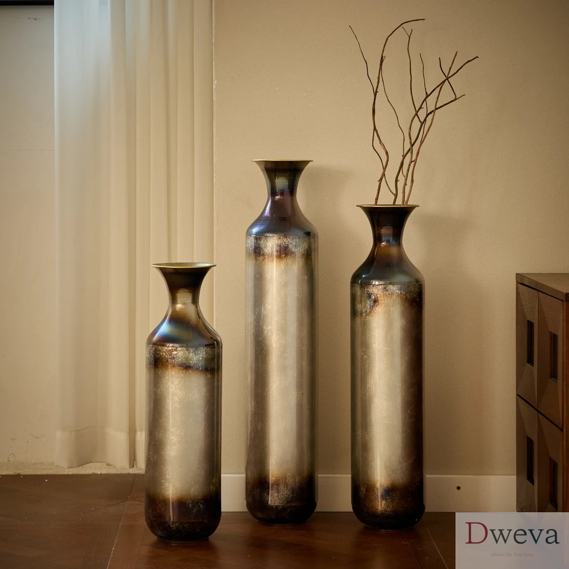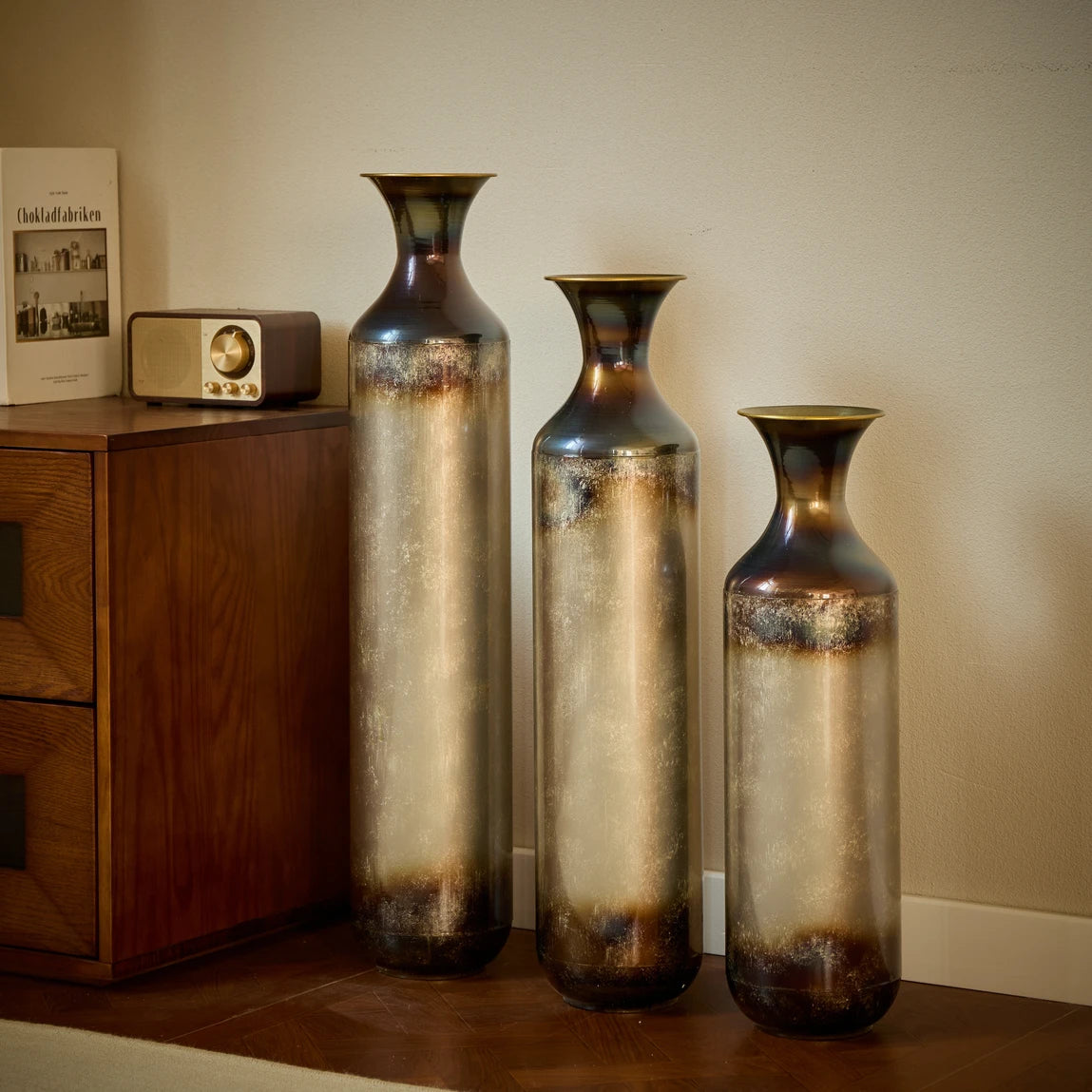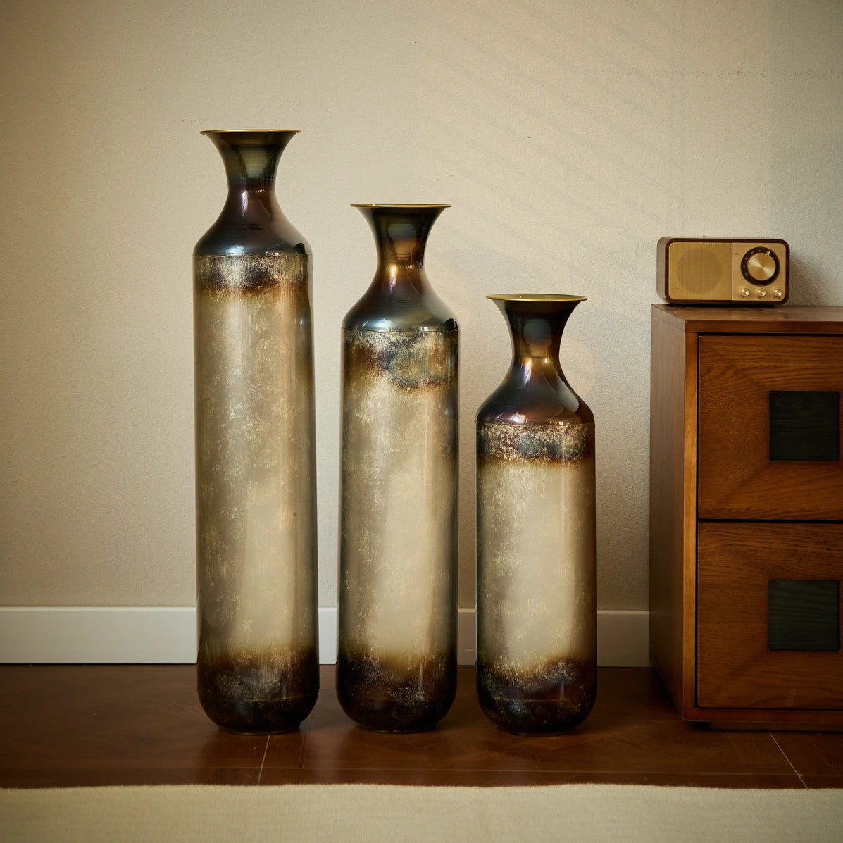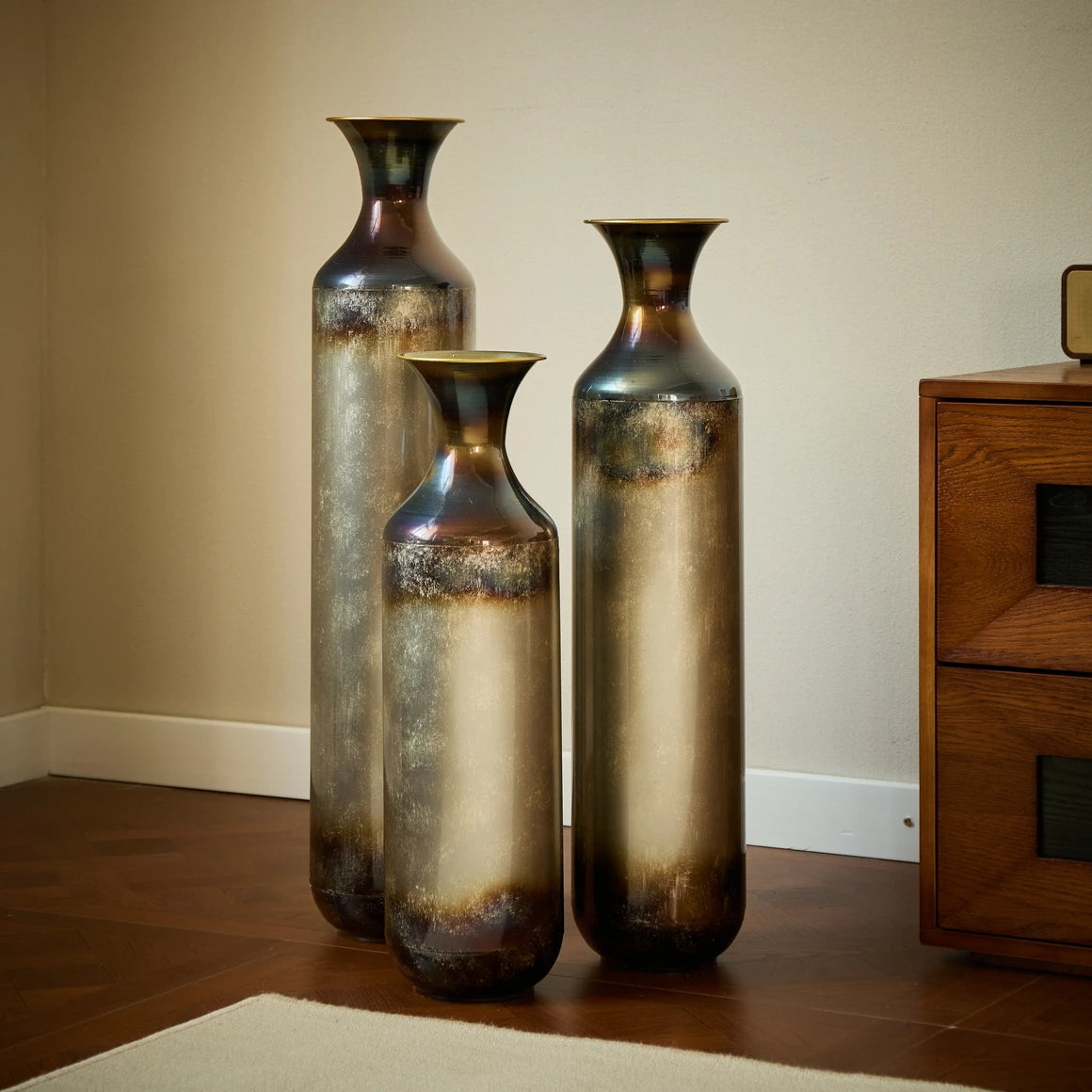 Here is a product description tailored to your requirements and based on the provided information:---Introduce a sense of drama and elegance to your home with this trio of tall metal vases, each showcasing a captivating blend of deep bronze, smoky gray, and pearlescent finishes. Crafted from sturdy metal, these cylindrical vases feature gently flared necks and subtle variations in color that give each piece a one-of-a-kind look. The design transitions from a dark-toned rim and base into a softly glowing center, creating an effect that evokes hand-blown glass or burnished ceramic. The set includes three sizesmeasuring approximately 20.6 inches, 24.4 inches, and 28.4 inches tall, each with a consistent diameter of 5.7 inches. Whether used to display dried botanicals or left empty as sculptural accents, these vases bring texture, depth, and sophisticated charm to living rooms, entryways, or corners in need of a refined focal point. Their rich tones and graceful silhouettes complement a range of interior styles, from classic to contemporary.Feature Bullets
