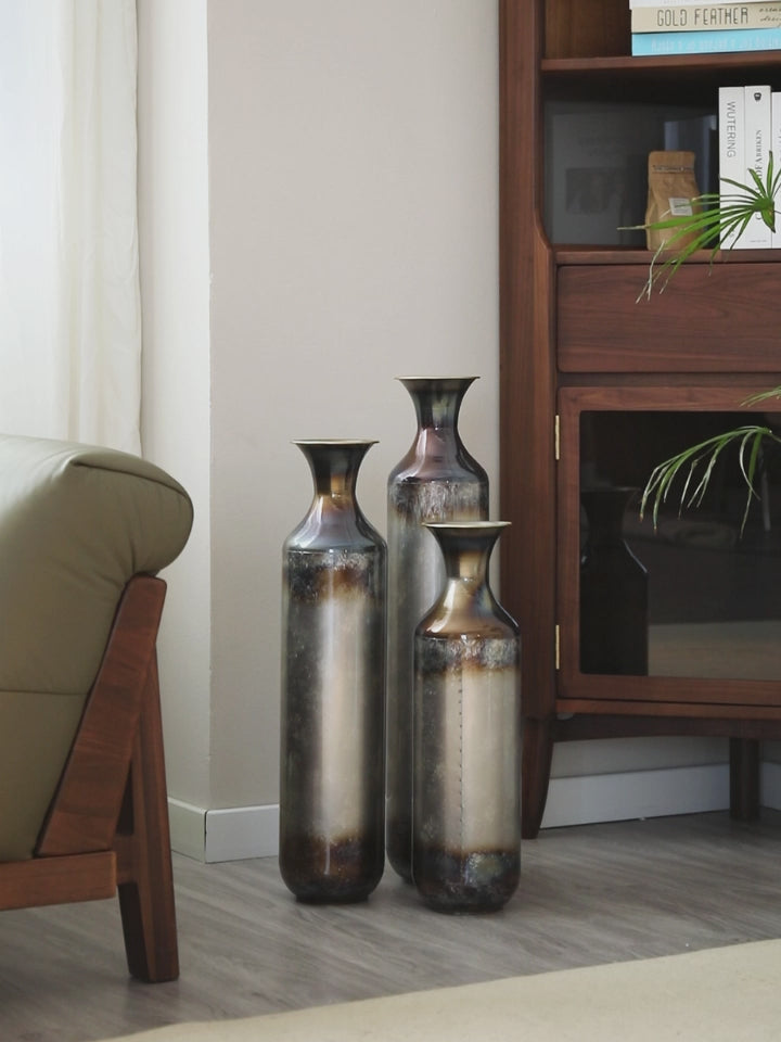 Here is a product description tailored to your requirements and based on the provided information:---Introduce a sense of drama and elegance to your home with this trio of tall metal vases, each showcasing a captivating blend of deep bronze, smoky gray, and pearlescent finishes. Crafted from sturdy metal, these cylindrical vases feature gently flared necks and subtle variations in color that give each piece a one-of-a-kind look. The design transitions from a dark-toned rim and base into a softly glowing center, creating an effect that evokes hand-blown glass or burnished ceramic. The set includes three sizesmeasuring approximately 20.6 inches, 24.4 inches, and 28.4 inches tall, each with a consistent diameter of 5.7 inches. Whether used to display dried botanicals or left empty as sculptural accents, these vases bring texture, depth, and sophisticated charm to living rooms, entryways, or corners in need of a refined focal point. Their rich tones and graceful silhouettes complement a range of interior styles, from classic to contemporary.