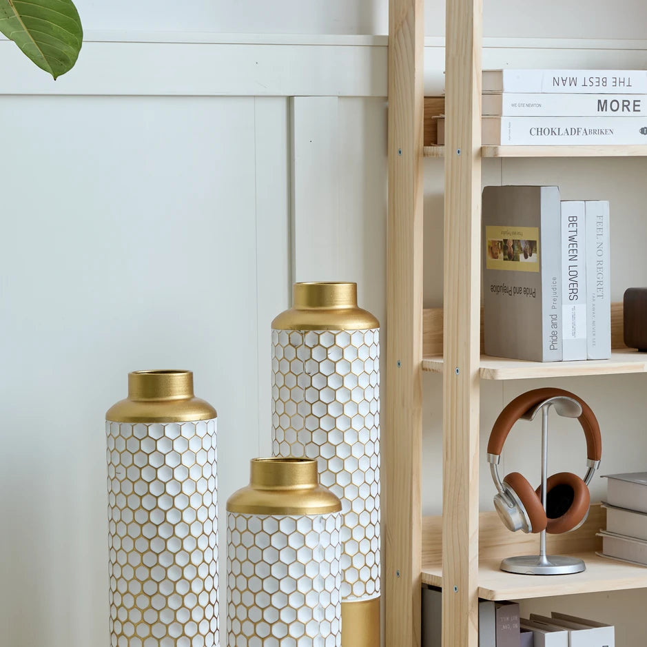 Here is a product description based on the provided details and following your guidelines:---Add a touch of modern glamour to your space with this set of tall metal vases, designed to impress with their sleek silhouettes and striking two-tone finish. Crafted entirely from durable metal, each cylindrical vase features a white honeycomb-textured center paired with a contrasting polished and hammered gold lower body for a luxurious look. Ideal as floor-standing accent pieces in living rooms, entryways, or dining areas, these vases come in three sizes to create a visually dynamic display. The large vase measures 5.59 inches in diameter and 32.6 inches in height, the medium stands at 28.34 inches, and the smallest at 24 inches. Together, the set weighs 15.2 pounds, ensuring stable placement while showcasing your refined taste in décor. Whether styled with branches or left empty as sculptural elements, these vases offer timeless sophistication and a bold decorative statement.Feature Bullets