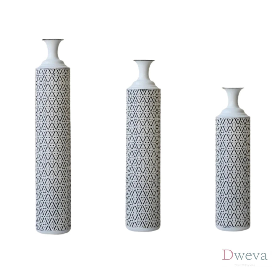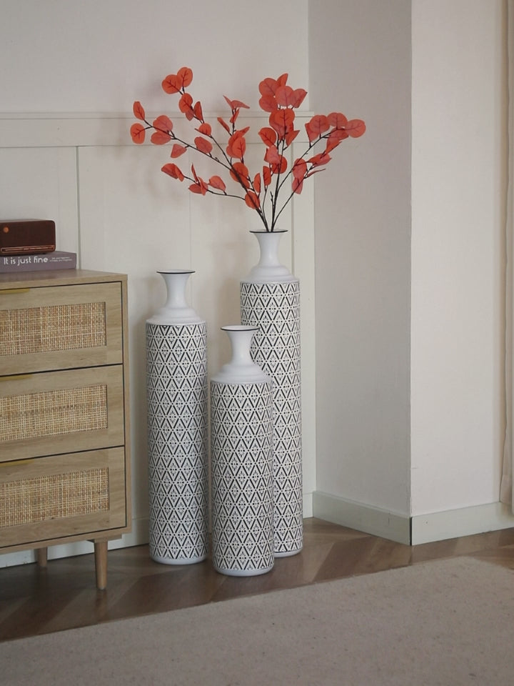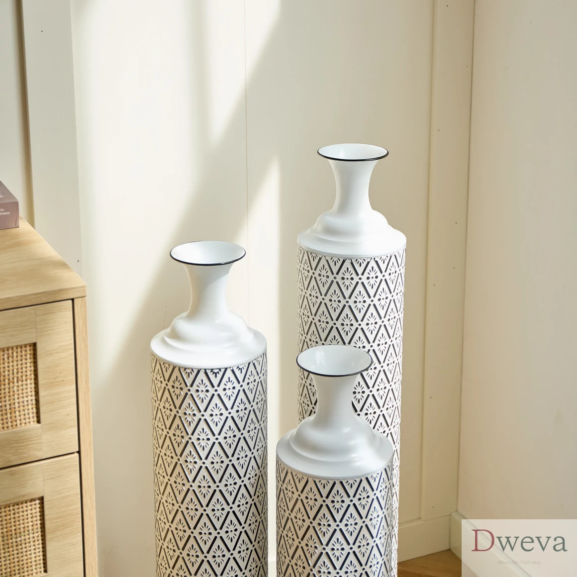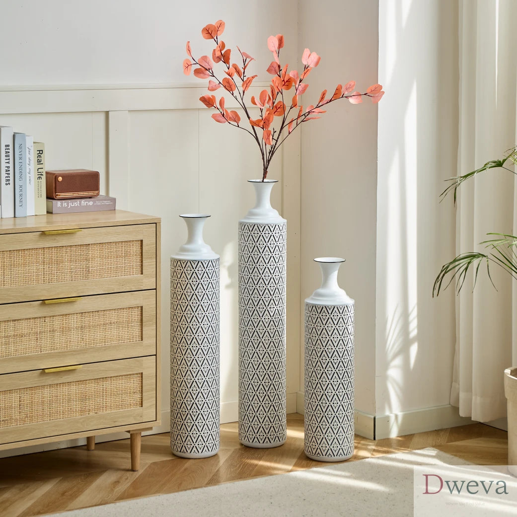 Modern Floor Vase Set – White & Black Metal Vases with Geometric Pattern – 3-Piece Home Decor Set in 24.8 in, 29.13 in & 33.85 in Heights