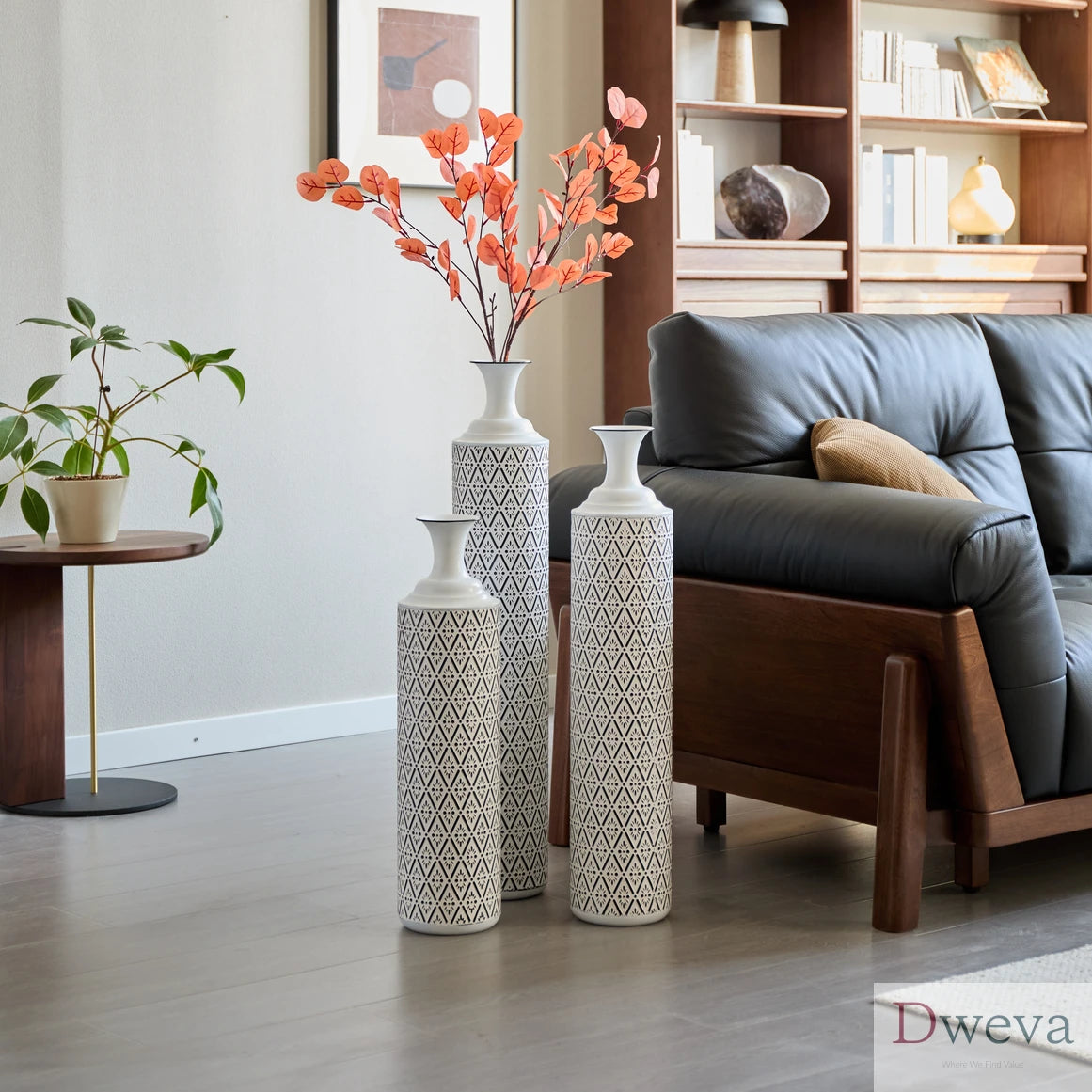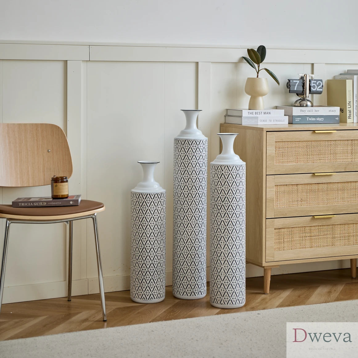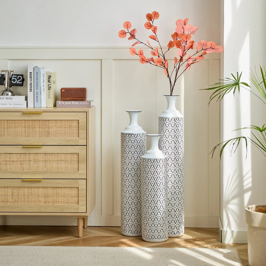 Modern Floor Vase Set – White & Black Metal Vases with Geometric Pattern – 3-Piece Home Decor Set in 24.8 in, 29.13 in & 33.85 in Heights