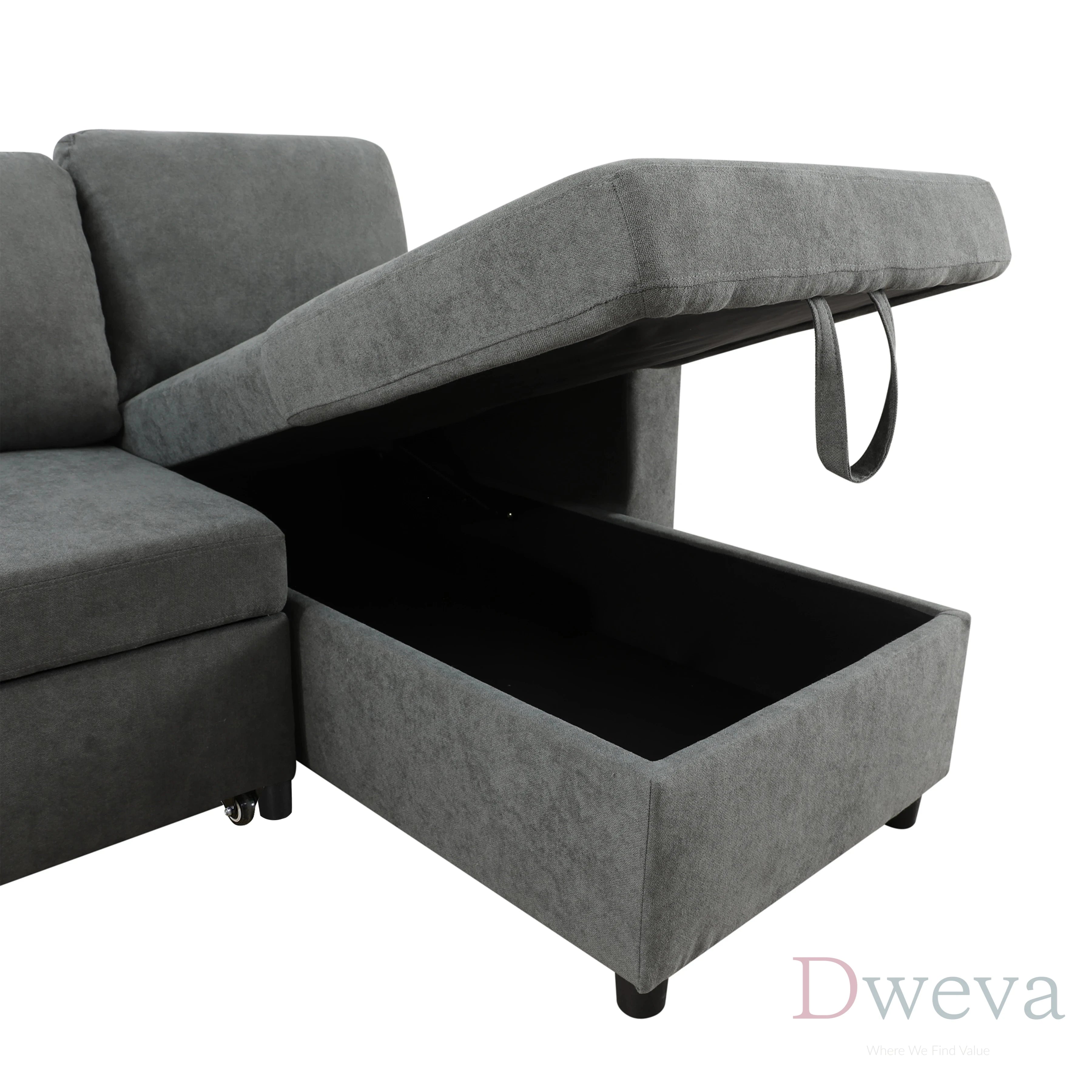 - Reduce clutter by storing blankets and pillows inside the chaise compartment.