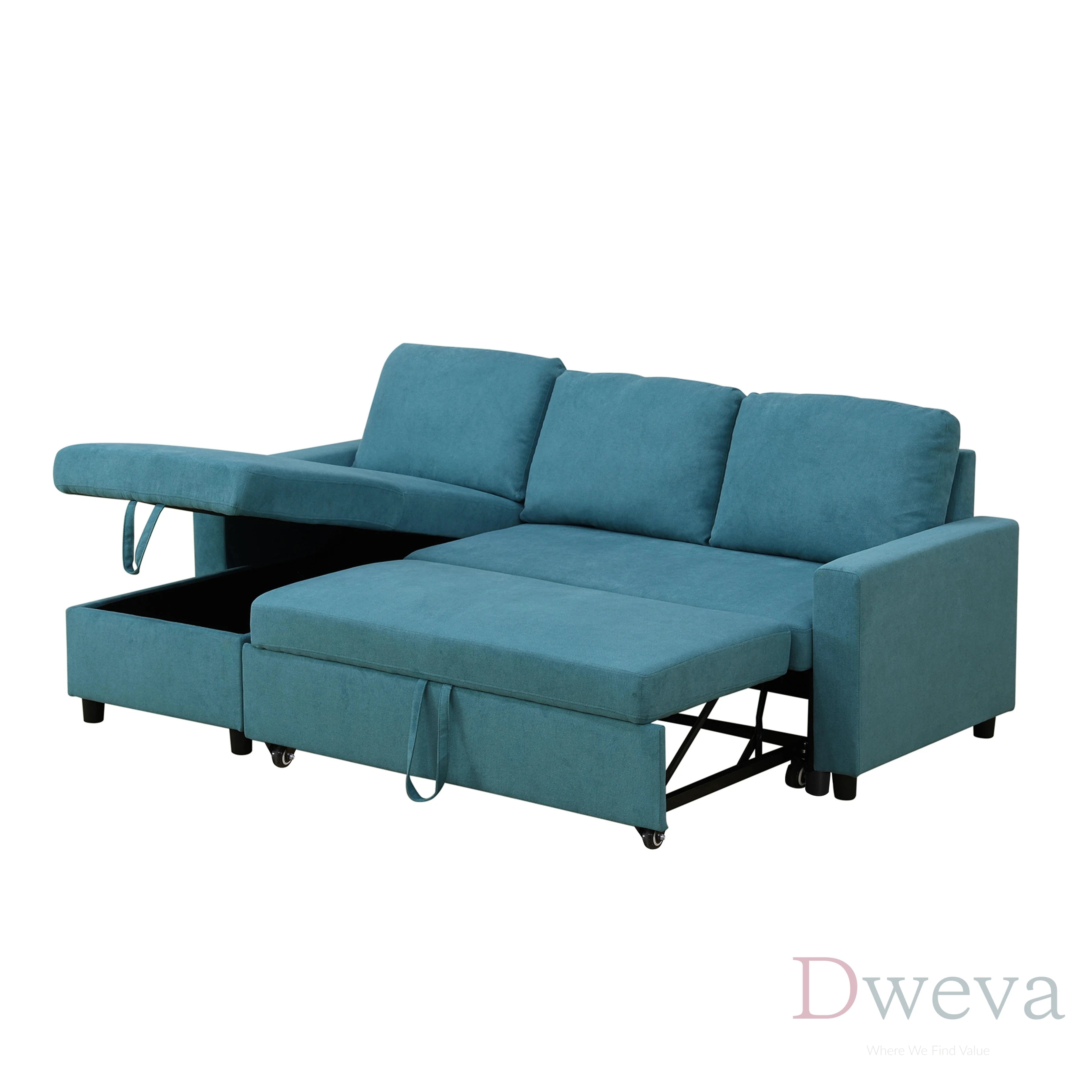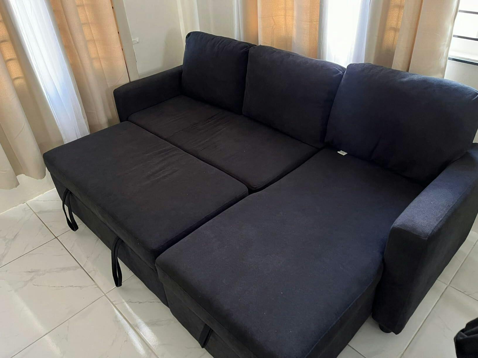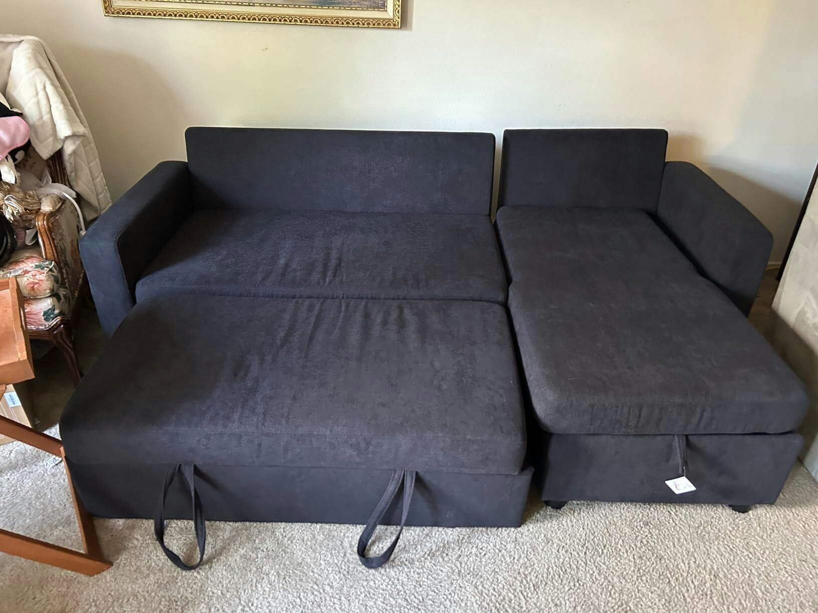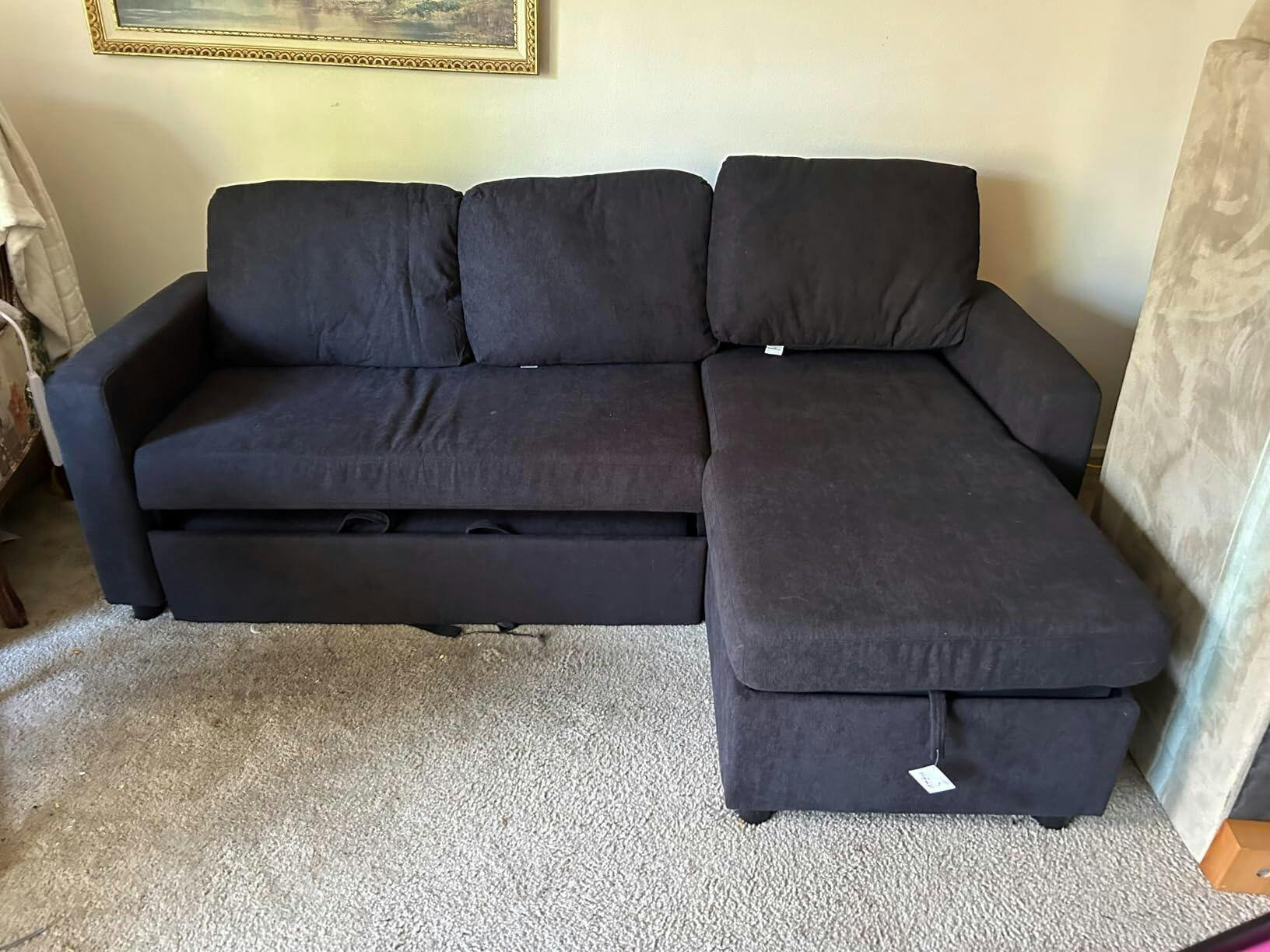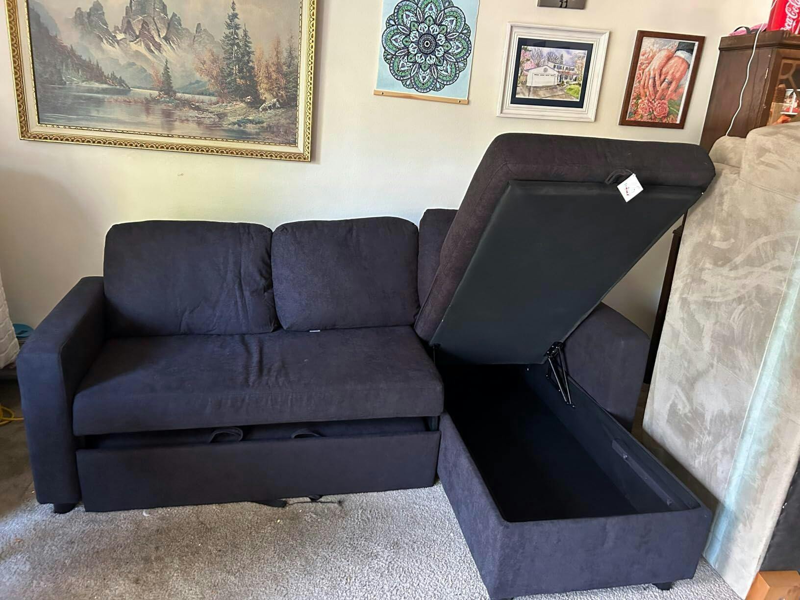 You’re paying for three practical functions in one: a sectional for daily seating, a pull-out sleeper for overnight guests, and a storage chaise to keep the room organized, supported by a solid wood frame and metal-reinforced structure.