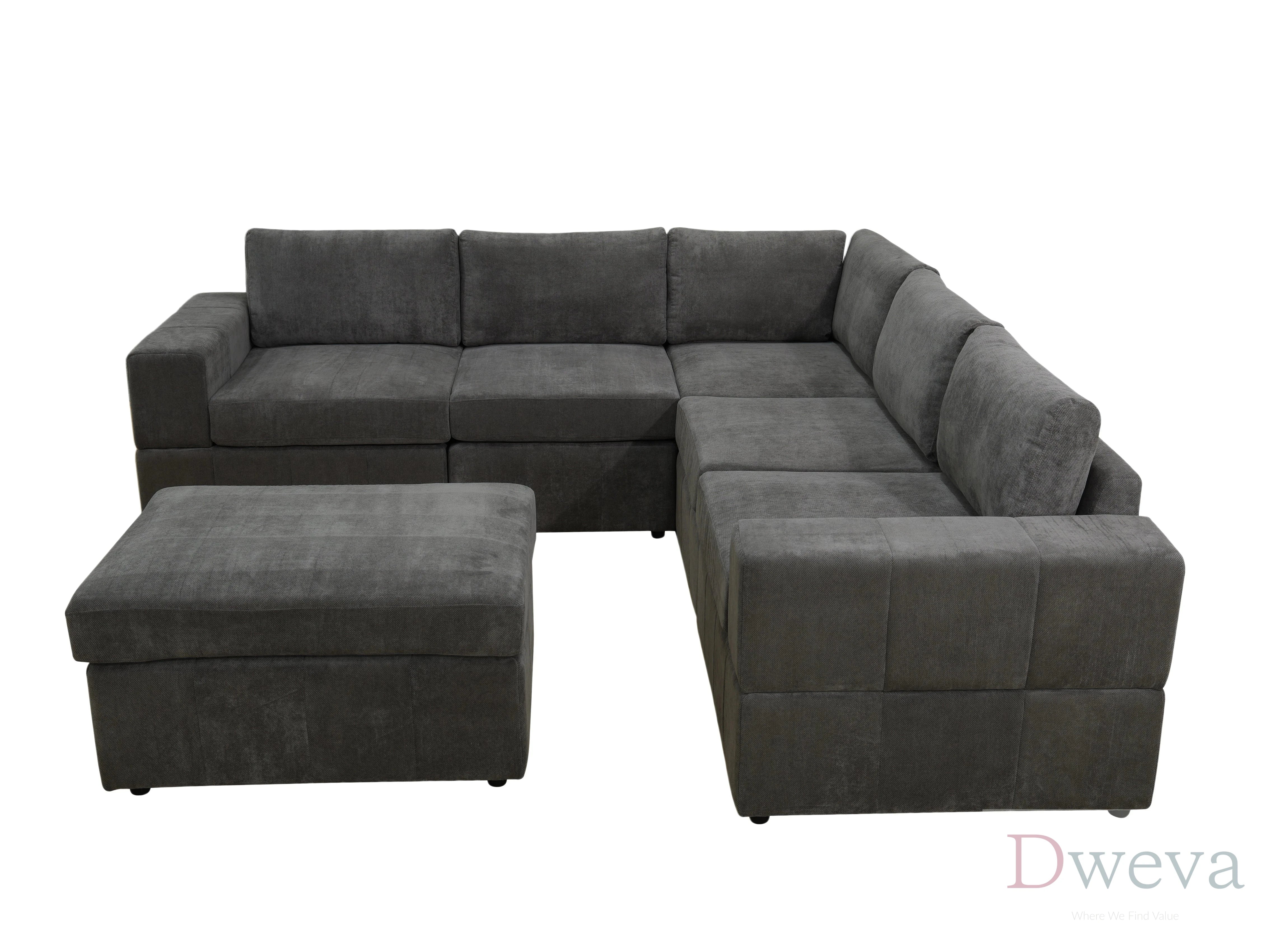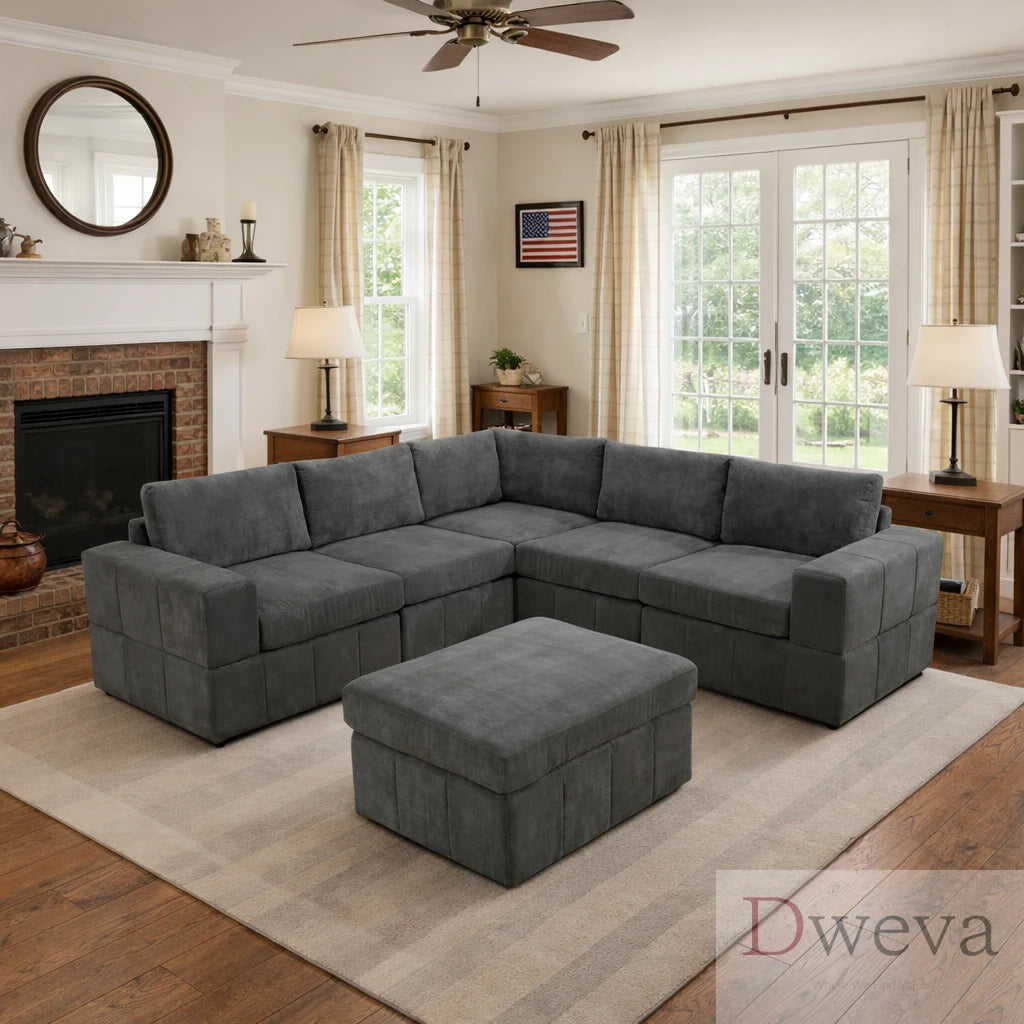 A 6-piece modular corner sectional with a matching ottoman, built for people who want a flexible living-room layout with lounge-friendly 24-inch seat depth and full-size 36-inch-deep modules for everyday lounging, hosting, and family use.