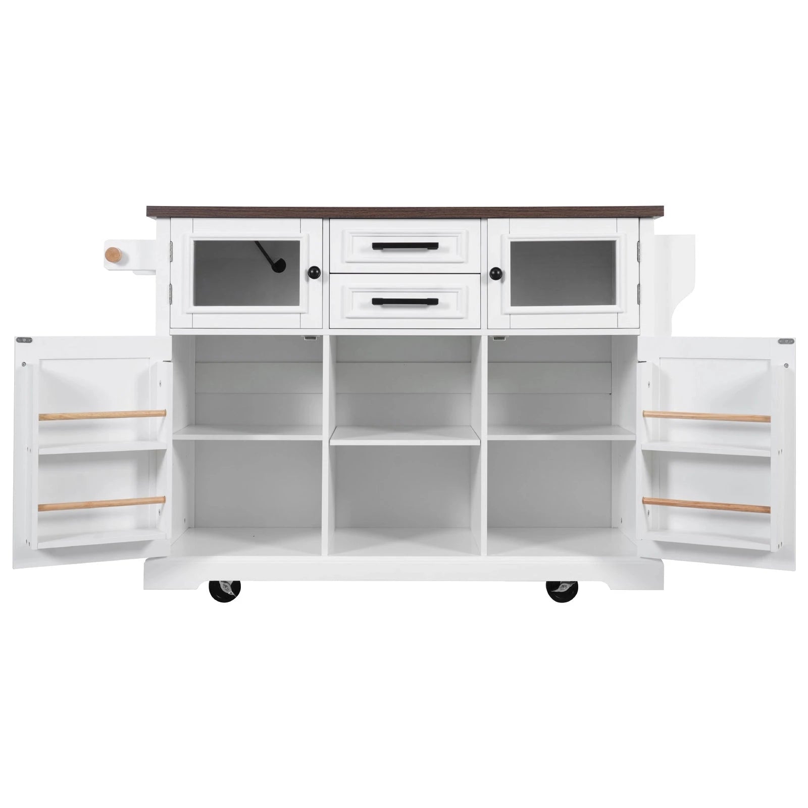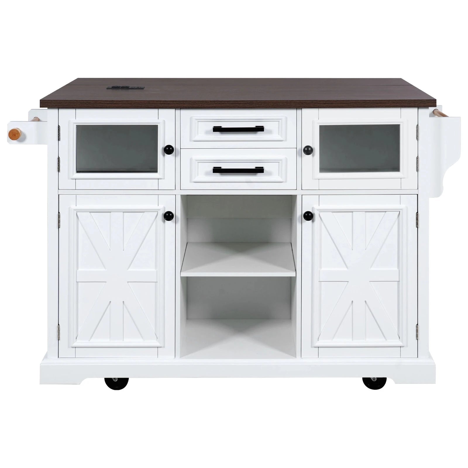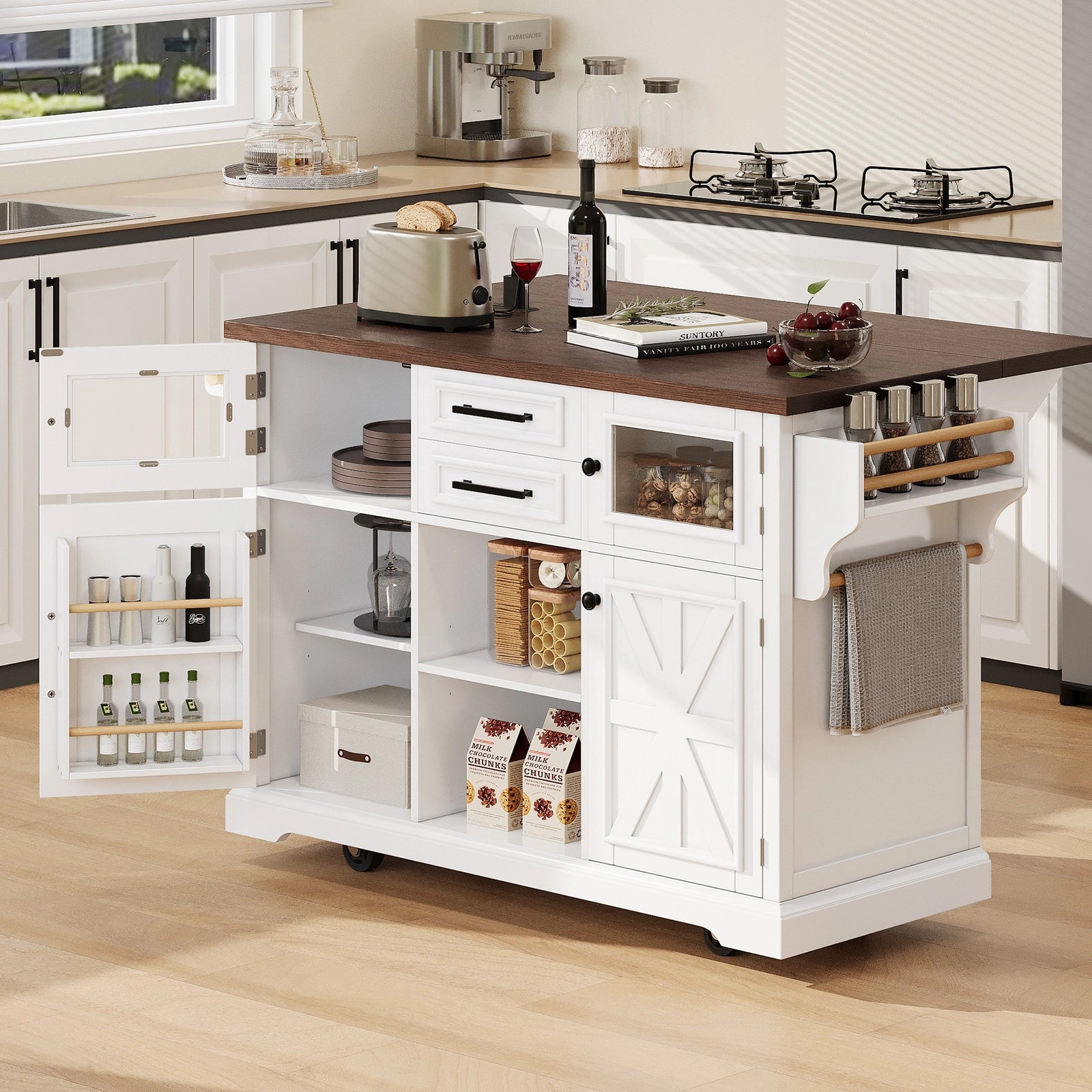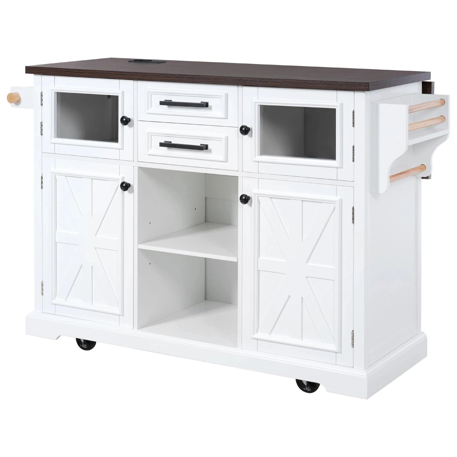 Highlights&SummaryHighlights [Large Size &Widen 47" W Kitchen Table][Cross Barn Doors & Visual Glass Door] [11.8" Drop Leaf ][4 Doors + 2 Deep Drawers][Farmhouse Embossed Texture Barn Door] [4 Internal Storage Rack][Ample Storage Space][4 * 360°Lockable Hidden Rotation Wheels] [Spice Rack &Towel Rack][Adjustable Shelves][Eco-friendly manufactured P2 MDF Board] Summary Introducing our 54.9-inch wide, beautifully and elegantly designed farmhouse kitchen island, a perfect fusion of embossed texture, cross-barn panel, and visual glass door that brings a touch of rustic charm to your home. With its spacious design and durable construction, this island is not just a statement piece but also a practical addition to any dining room or kitchen area. This large kitchen island contains 2-tier door interior storage rack for spices and jars. Power outlets and towel racks on the same side add another level of functionality. Crafted from rubber wood table and high-quality MDF and rubber wood side pillar, it offers ample storage (2 drawers and 4 cabinets) for your kitchen essentials while blending seamlessly with a variety of interior styles, from farmhouse to modern. SpecificationsProduct Dimension(Overall) 54.9 x 29.5 x 36 inches Product Weight 125.44 LBS Package Dimension 52.5 x 23.4 x 13.5 inches Package Weight 142.42 LBS Detail Product Dimension Please refer to the size image Number of Package 1 Tabletop Weight Capacity 400 LBS Drawer Weight Capacity 22 LBS Shelf Weight Capacity 75 LBS Drop Leaf Weight Capacity 33 LBS Material P2 Grade Environmental MDF Country of Origin Vietnam Estimated Time to Assemble 40-60 minutes Product NoticeProduct Care Notice 1. Wipe with a soft dry cloth. Avoid the use of harsh chemicals and household cleaners as they may damage the finish. 2. Hardware may loosen over time; periodically check that all connections are tight. Color Notice Real Product’s Color may be a little different from the image due to the lighting or monitor’s display. Size Notice Manual measurement has been used, there may be some reasonable error.