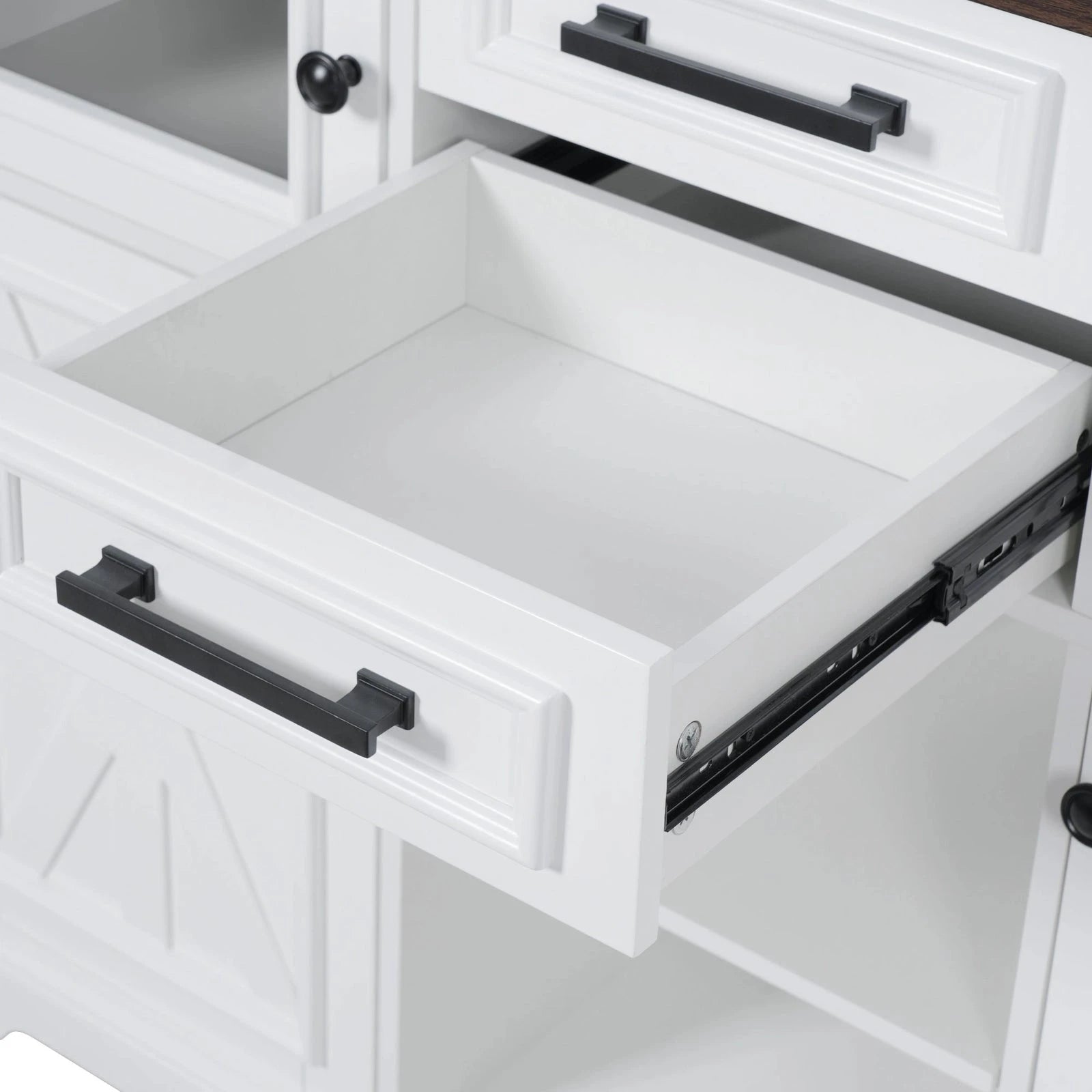| Highlights | [Large Size &Widen 47" W Kitchen Table][Cross Barn Doors & Visual Glass Door] [11.8" Drop Leaf ][4 Doors + 2 Deep Drawers][Farmhouse Embossed Texture Barn Door] [4 Internal Storage Rack][Ample Storage Space][4 * 360°Lockable Hidden Rotation Wheels] [Spice Rack &Towel Rack][Adjustable Shelves][Eco-friendly manufactured P2 MDF Board] |