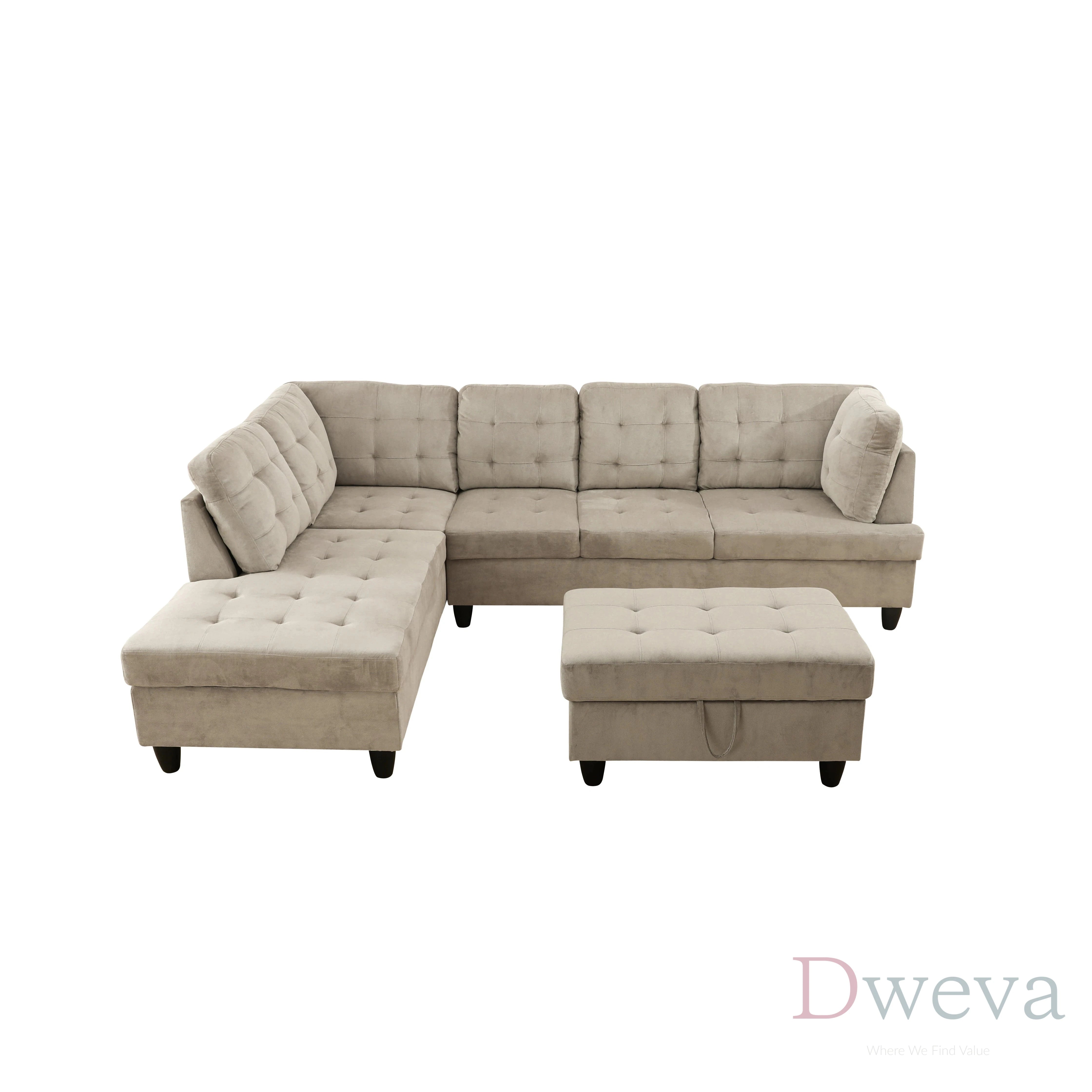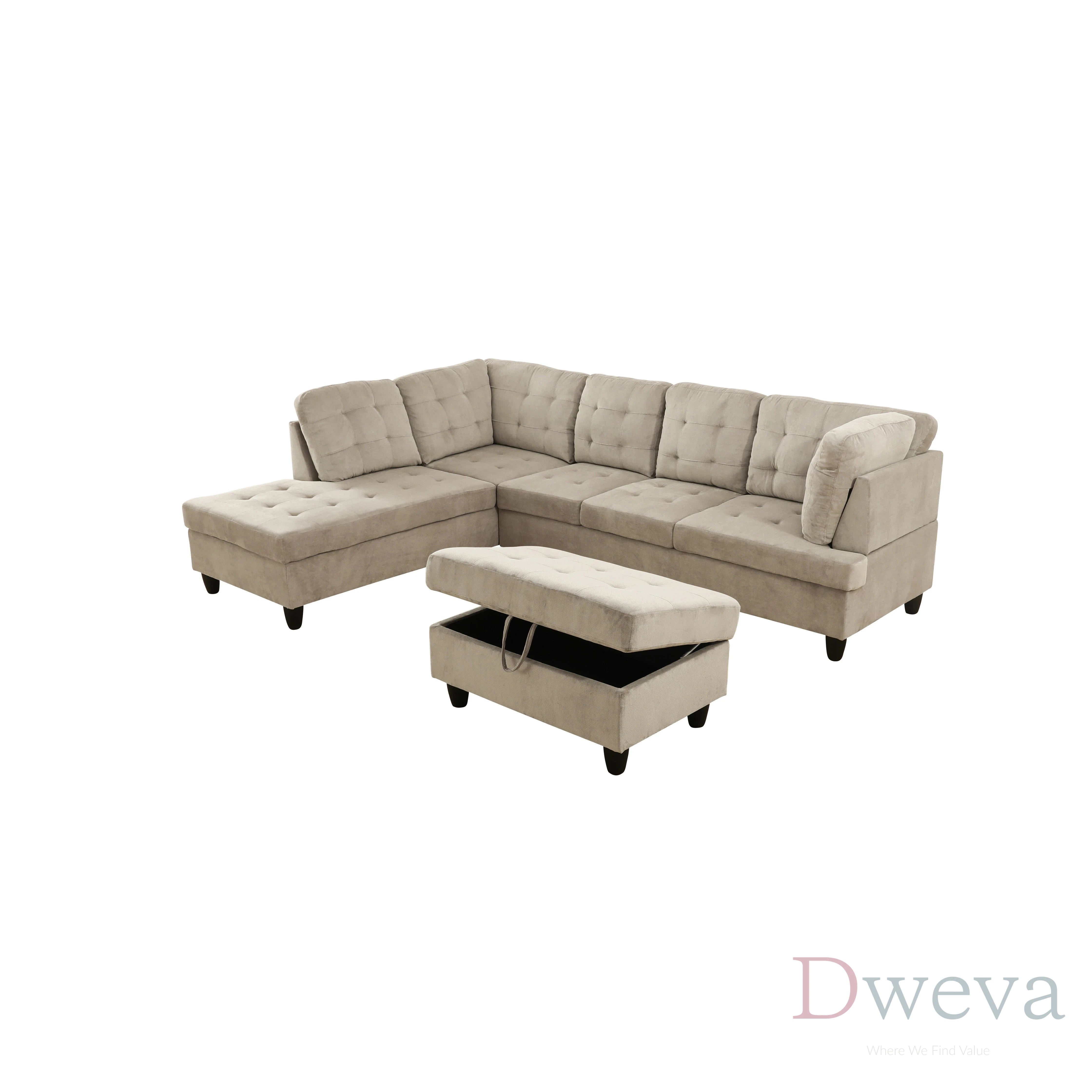 | Set value: 3 pieces included (sofa + chaise + storage ottoman) | Set value: Often sold as a sectional without an ottoman, or the ottoman is a separate add-on |