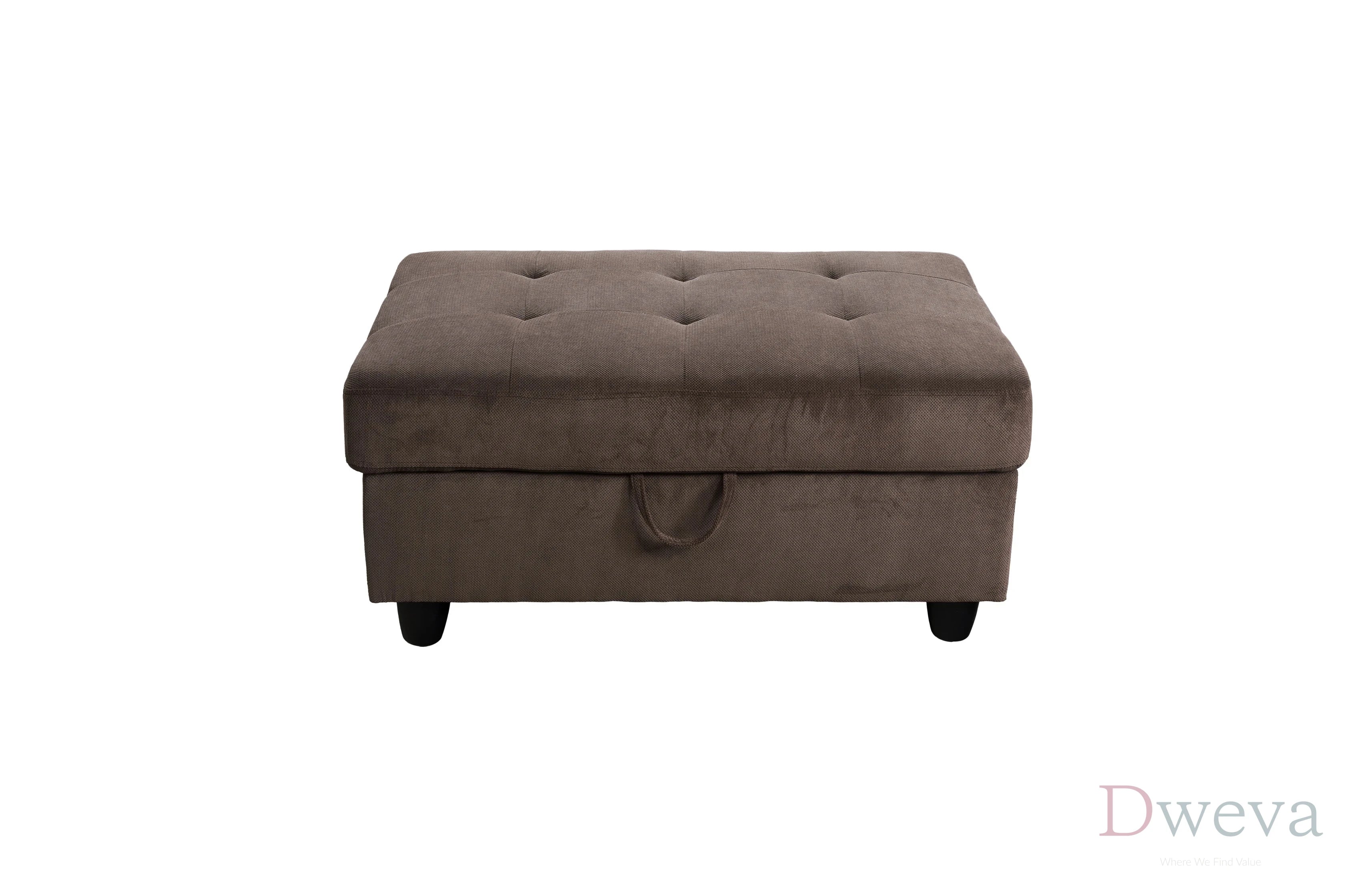 - Ottoman is shown with lift-top storage and includes a pull strap