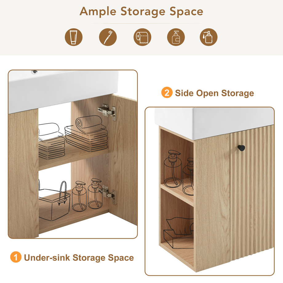 Upgrade your bathroom with this space-conscious floating vanity. Designed with a wave-patterned door and black handle, it adds a stylish touch to modern interiors. The left-side storage compartment provides practical organization for daily essentials, helping keep the space tidy. Built with a high-quality ceramic basin featuring an overflow hole, it offers both durability and added protection. The soft-close door reduces noise, enhancing everyday comfort. With a compact size of 21.6" × 12.2" × 26.4", this vanity is a great fit for smaller bathrooms or limited areas, blending aesthetics and function without compromise.